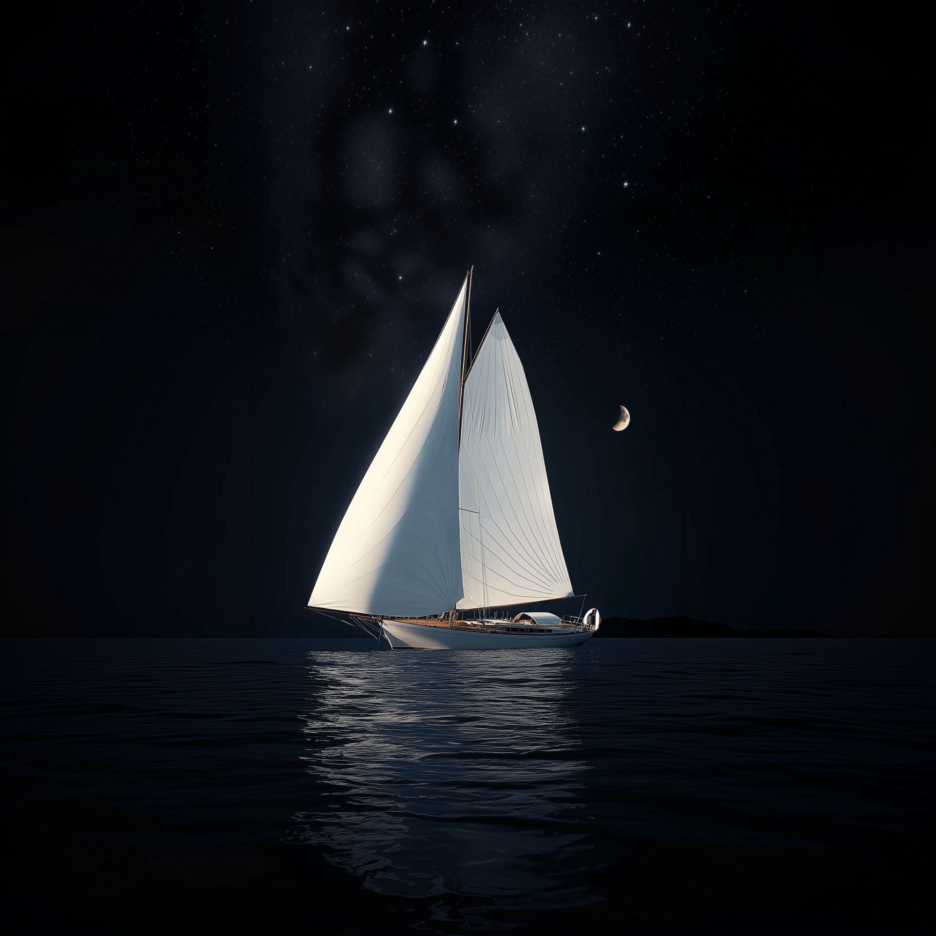 In this stunning photograph, a bright white sailing yacht floats serenely on a dark sea under a starry sky. The scene is illuminated by the soft glow of the moonlight, creating a minimalistic yet captivating atmosphere.