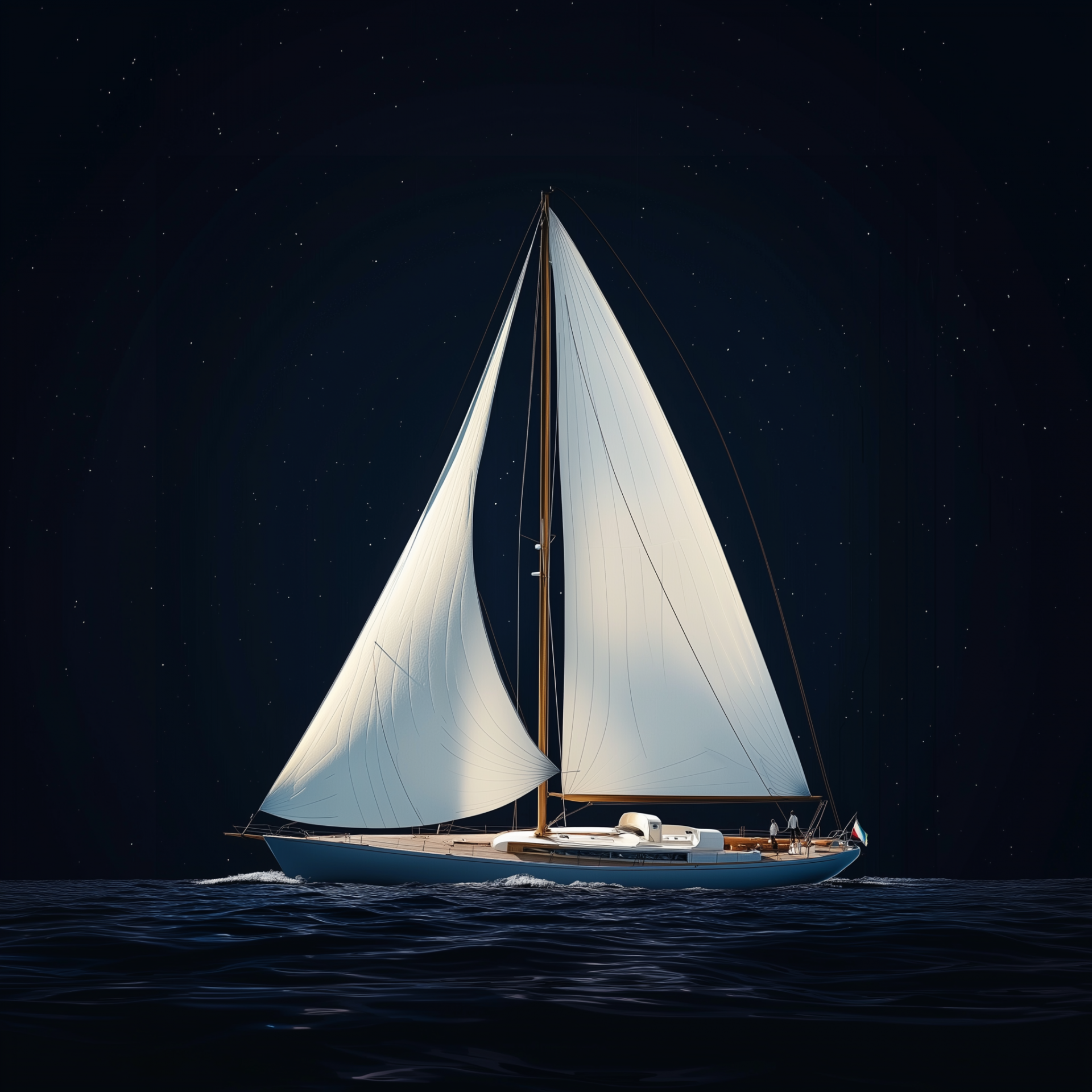 This captivating photograph depicts a realistic sailing yacht captured from the side view, set against a minimalistic navy blue background. The gentle waves and sparse stars in the sky evoke a serene and tranquil atmosphere.