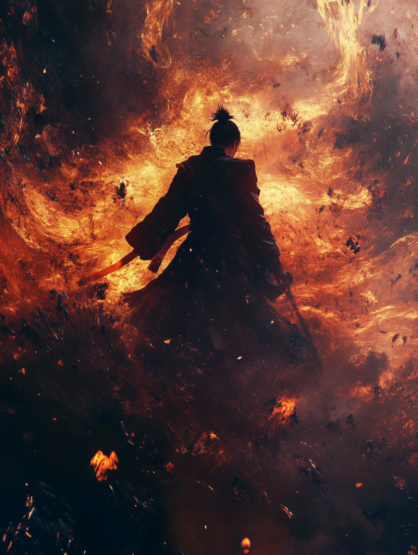 The image depicts a lone samurai in battle, surrounded by an intense atmosphere. He stands out with a dramatic black aura that glows, enhancing the epic nature of the scene.