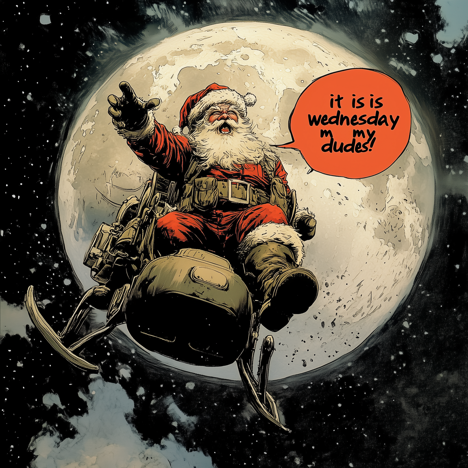 The illustration features a vibrant Santa Claus having fun on his sleigh against a picturesque full moon backdrop. A playful text bubble adds a humorous touch, capturing the whimsical spirit of the holiday season.