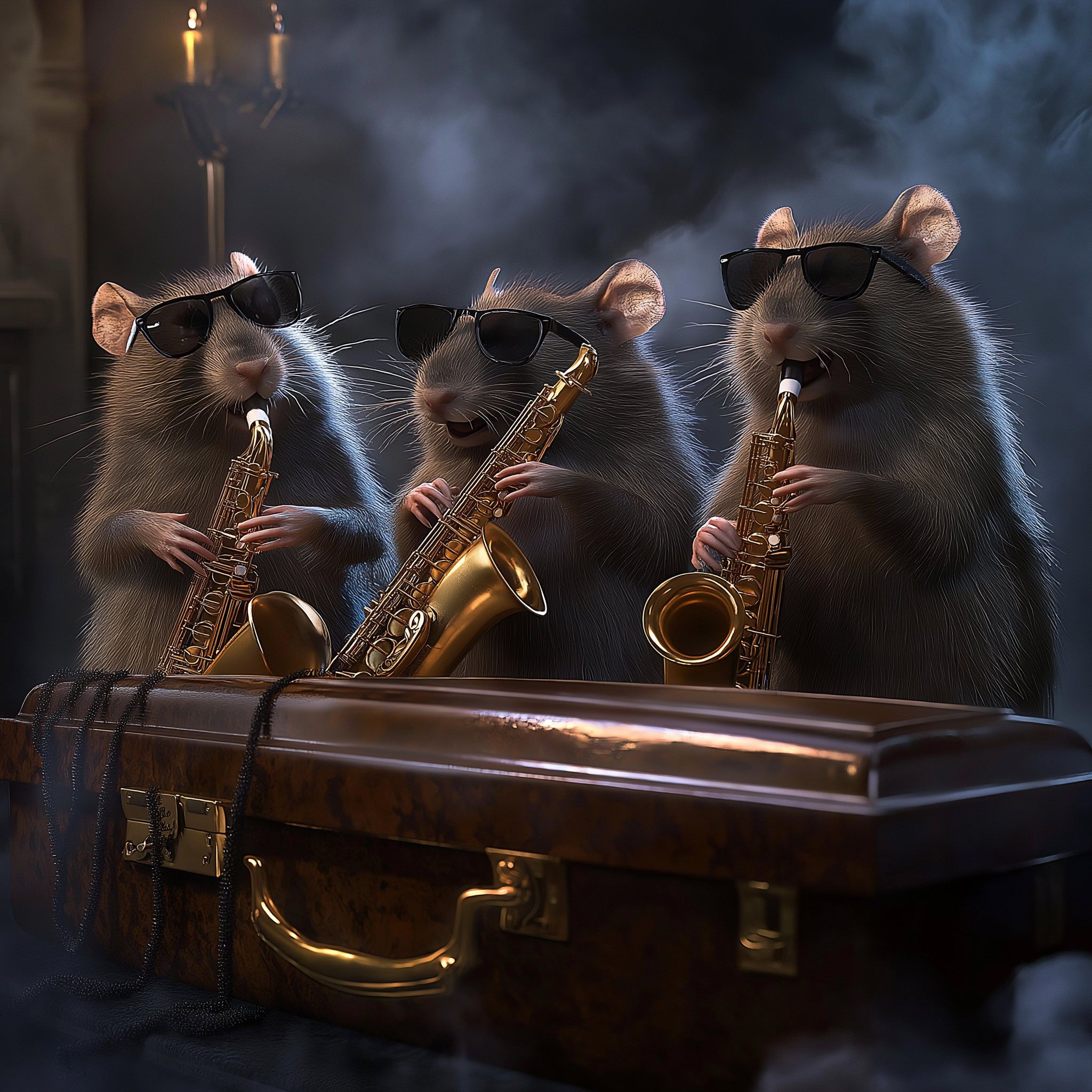 The image captures a whimsical scene where three rats are energetically playing saxophones in harmony. Their sunglasses add a humorous touch against the solemn backdrop of a large casket.