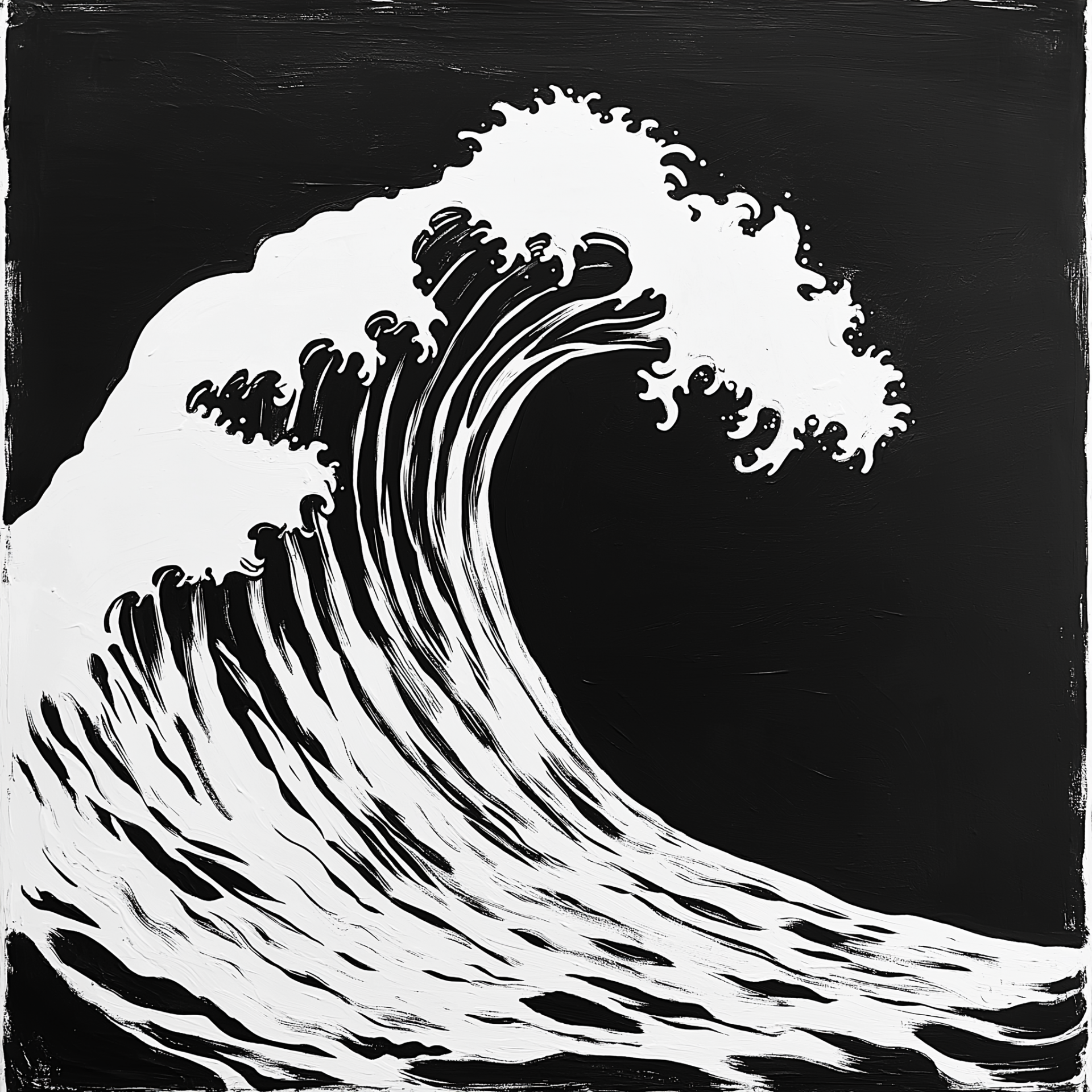 This illustration features a simple black ocean wave rendered in a block print style. The design is inspired by Scandinavian artistry of the 1970s, presenting a striking contrast against a white background.