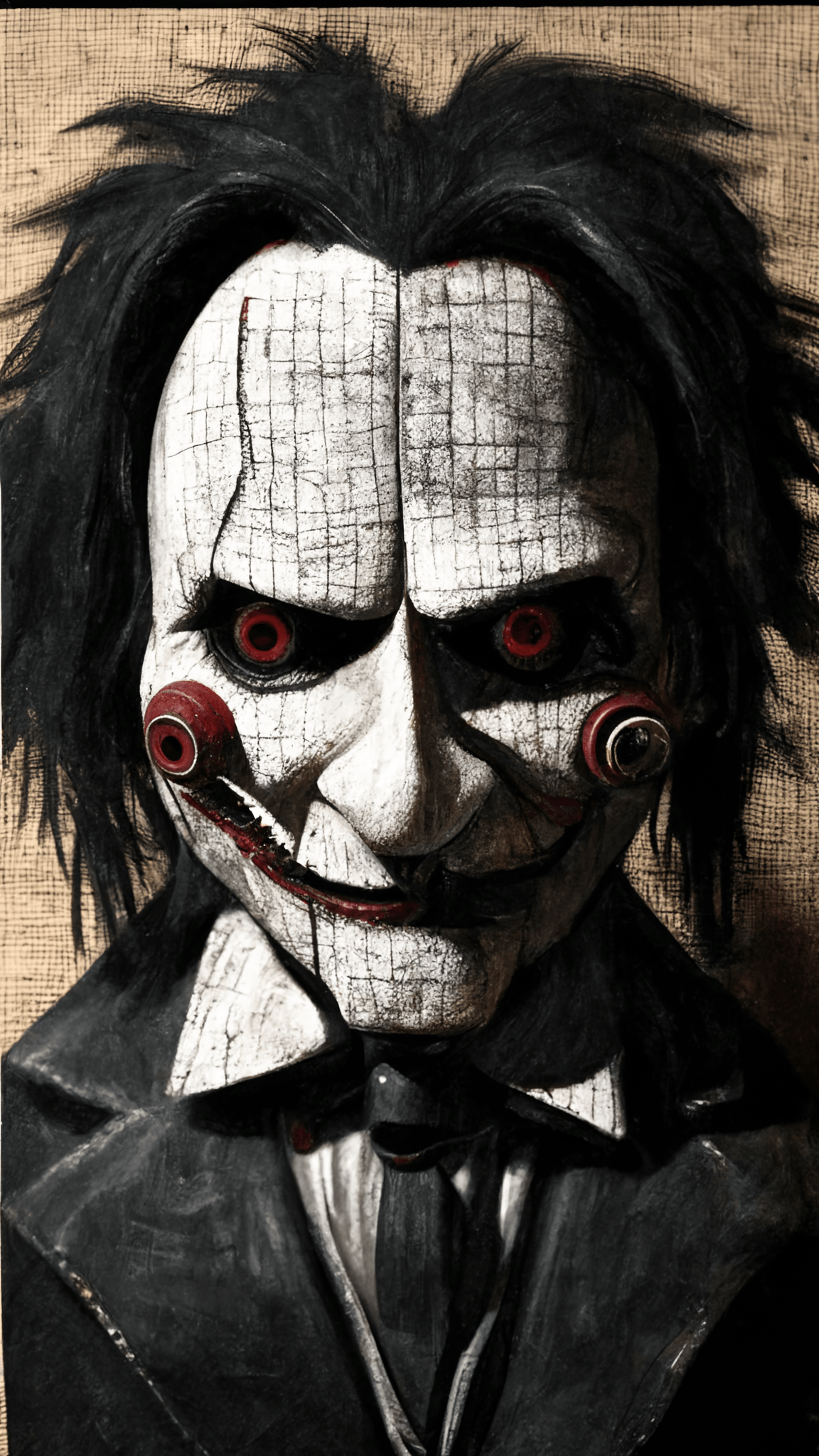 An eerie and suspenseful illustration featuring a jigsaw puppet in a dark and twisted conte drawing style, reminiscent of the suspenseful atmosphere of the movie, SAW.