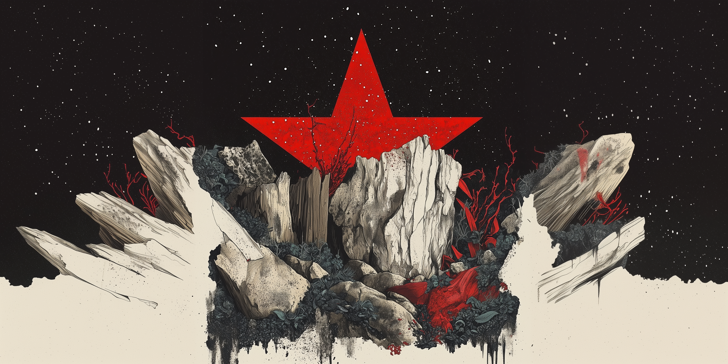 An intriguing illustration featuring abstract textures of rock, wood, leaves, and algae in red, black, and beige colors. A striking large red star stands out in the background against a black backdrop.