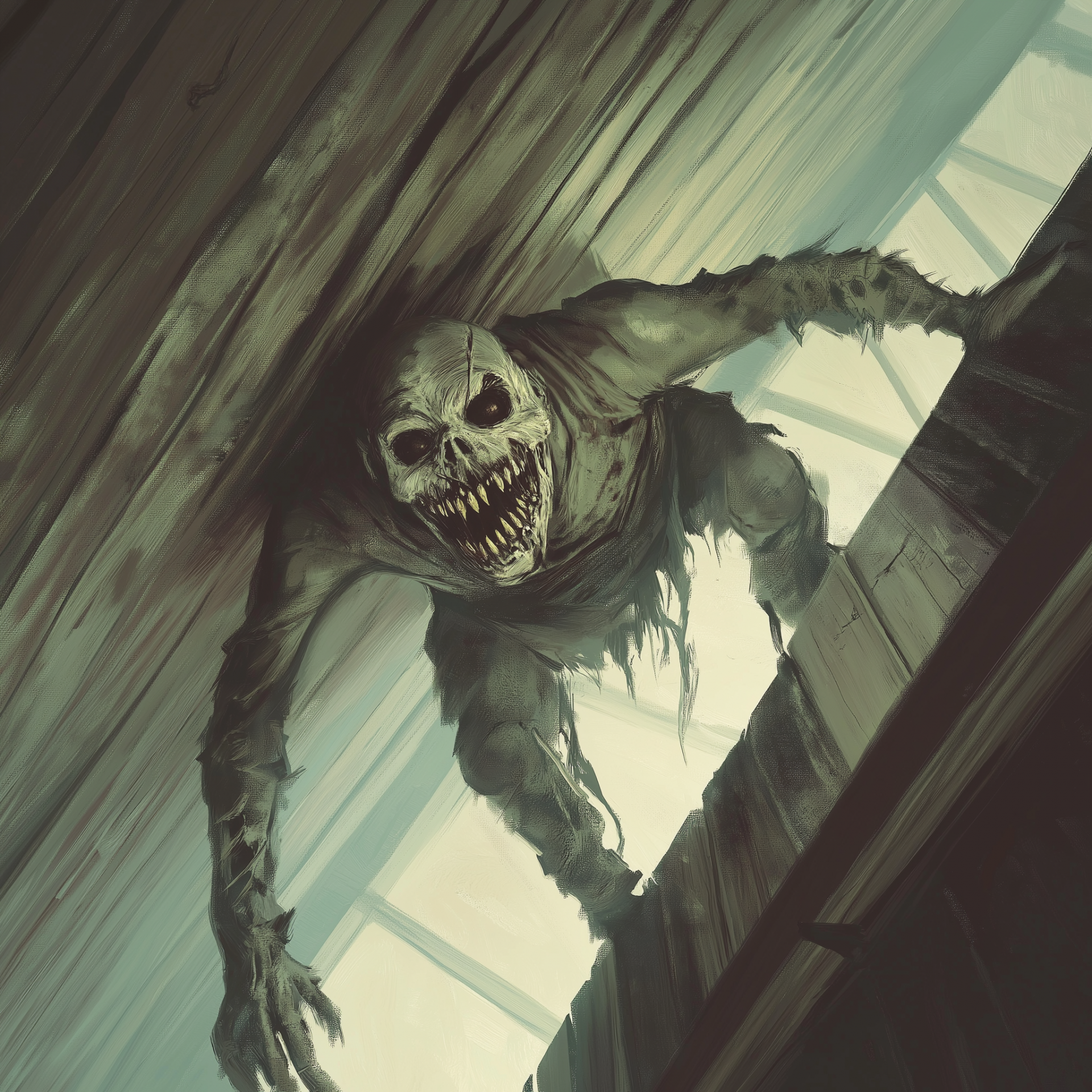 The image features a grotesque ghoul with pale skin, eerily crawling on a barn ceiling. Shadows create a chilling atmosphere, enhancing the horror and dread of this unsettling scene.