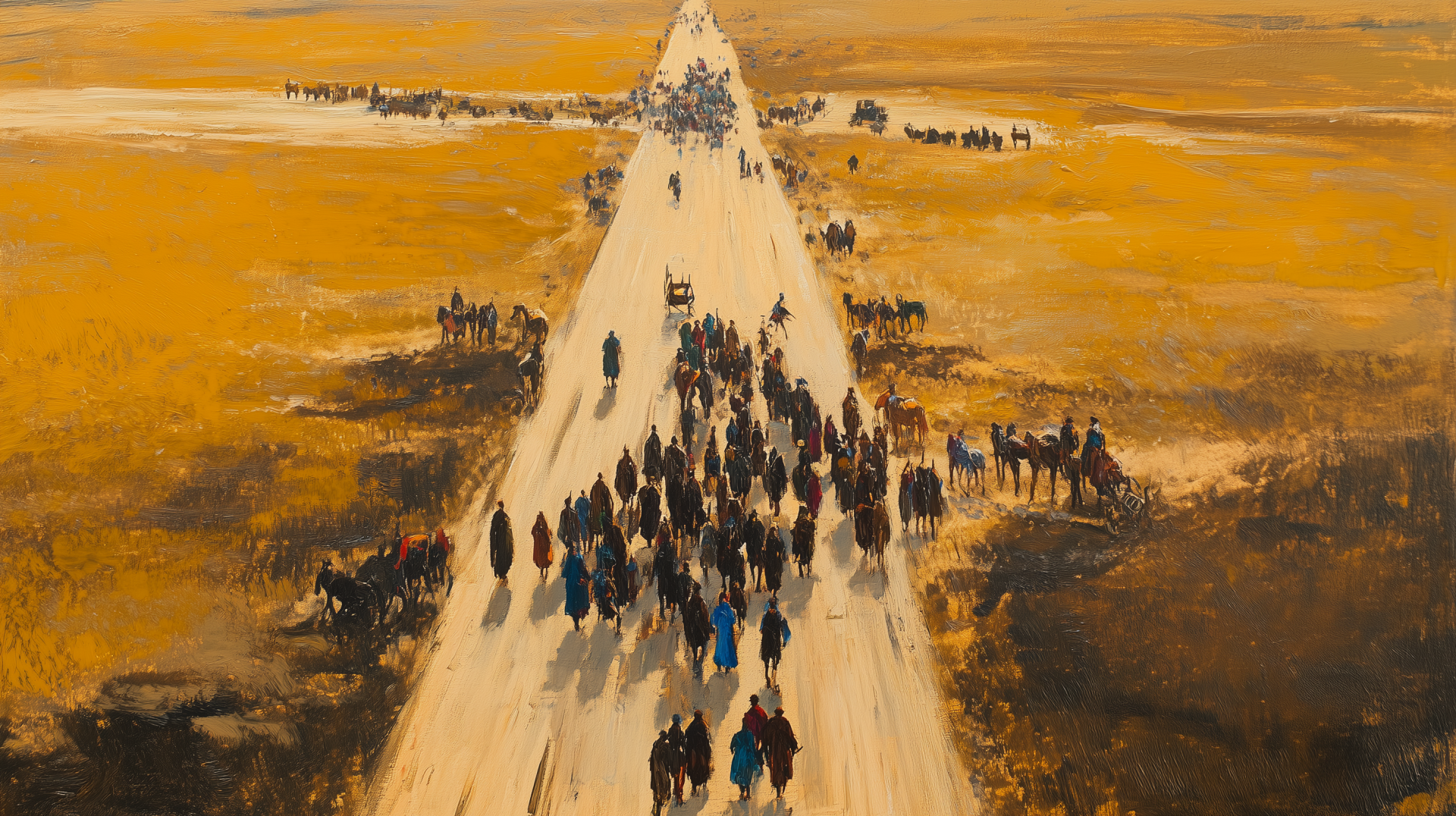 This image captures an expansive aerial view of a long paved road lined with refugees traversing a vast steppe. The scene embodies a medieval atmosphere with earthy tones and hints of glass painting styles.