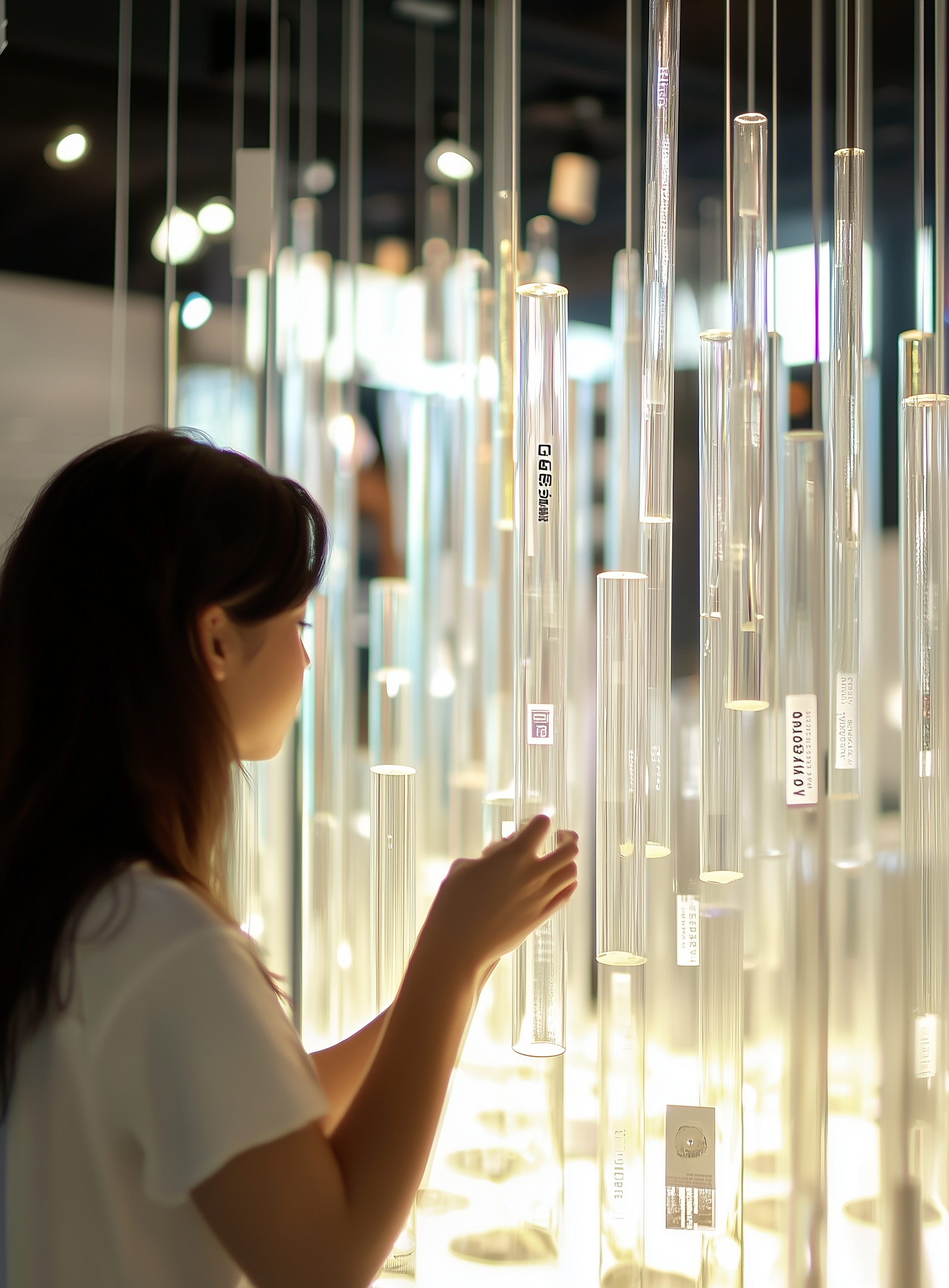 The exhibition space features tall, sleek glass pipes that are designed to be both elegant and inviting. Each pipe provides a unique scent experience, enhanced by modern digital displays that engage visitors in a captivating sensory journey.