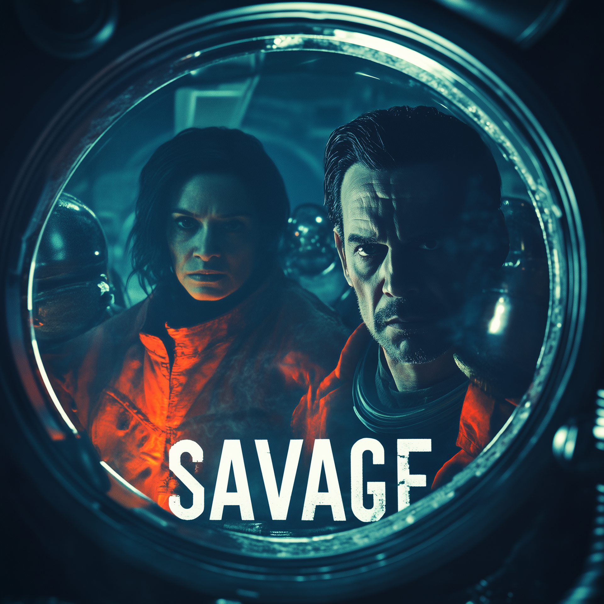 The image presents a photorealistic poster capturing an eerie atmosphere surrounding a spaceship crew. Moody cinematic lighting and dramatic angles enhance the psychological horror theme, drawing the viewer into the unsettling narrative.