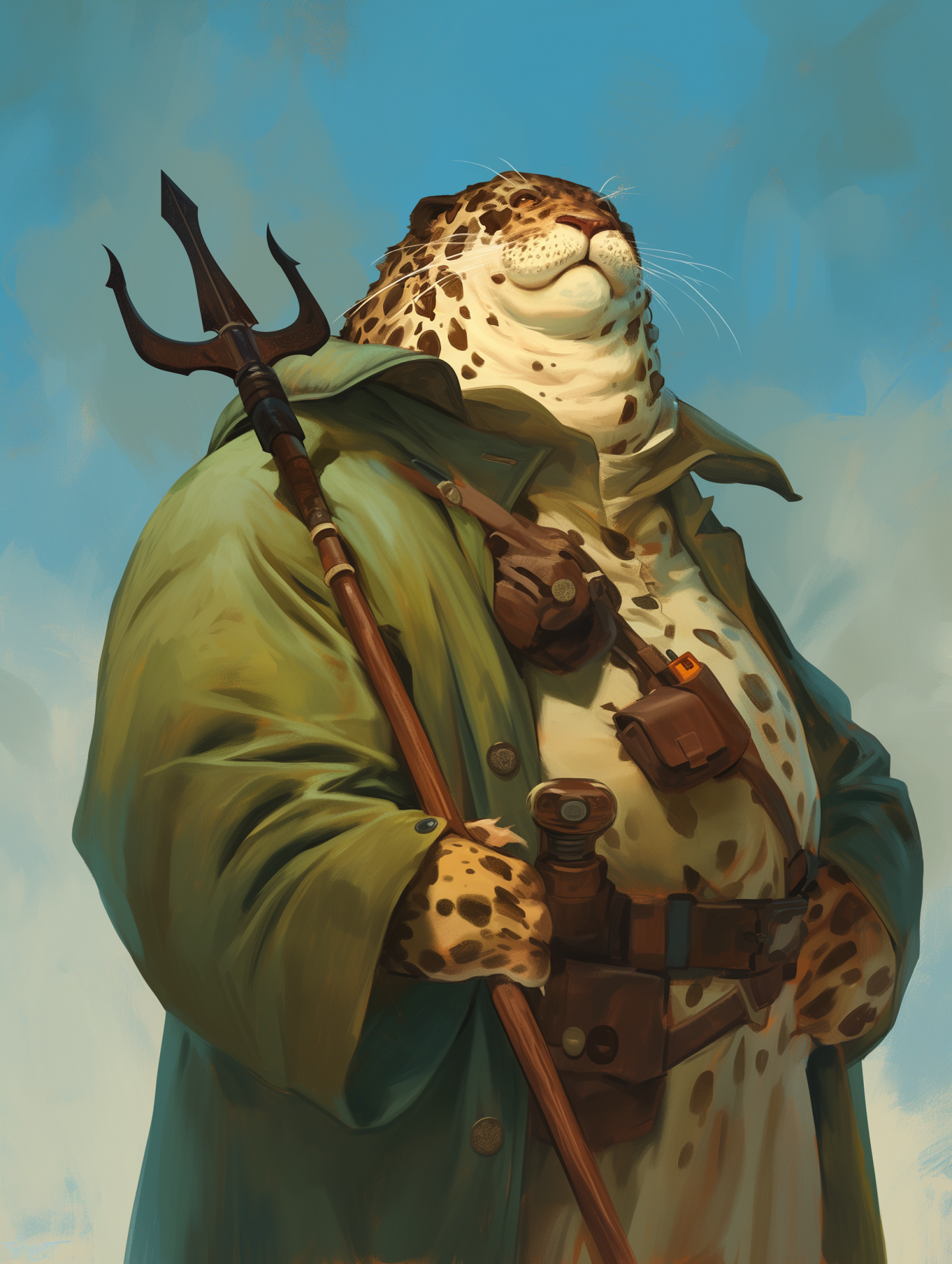 The image features a close-up portrait of a large, anthropomorphic seal with a broad double chin and sea leopard patterned skin, exuding a sense of wisdom and strength. The character holds a trident and is adorned in a flowing green coat, set against a beautifully painted gouache background that enhances the cinematic feel.