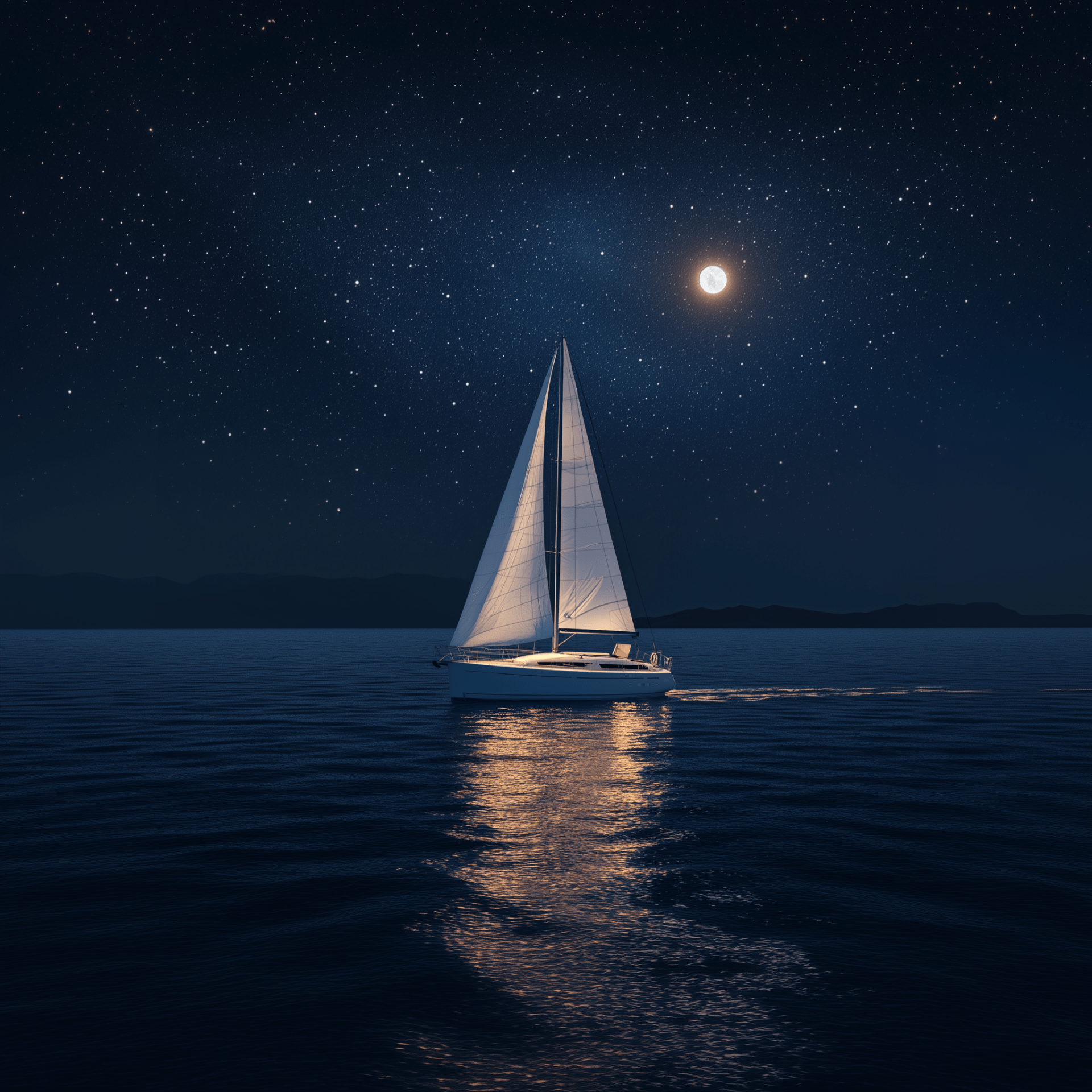 A bright white sailing yacht glides gracefully across a dark sea, illuminated by the shimmering light of a full moon. The starry sky adds a tranquil backdrop to this serene and minimalistic scene.