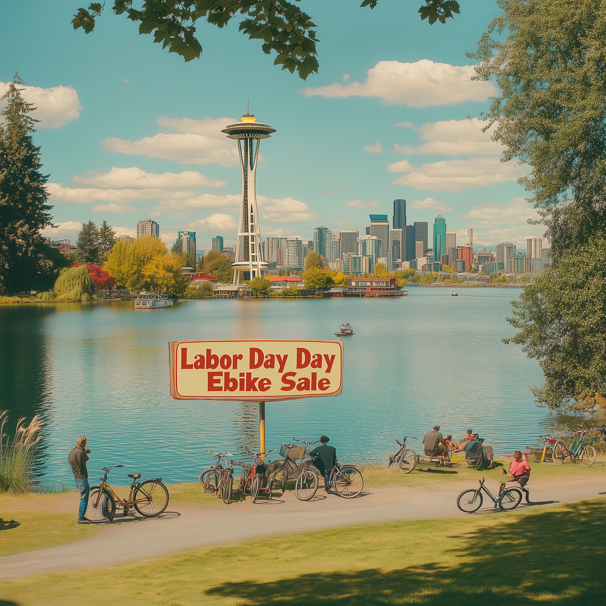 A retro-inspired image showcasing Greenlake Park in Seattle, featuring a giant sign floating in the middle of the lake with the words 'Labor Day Ebike Sale'. The city skyline, including the iconic Space Needle, can be seen in the distance, while cyclists rest by the lake in the foreground.