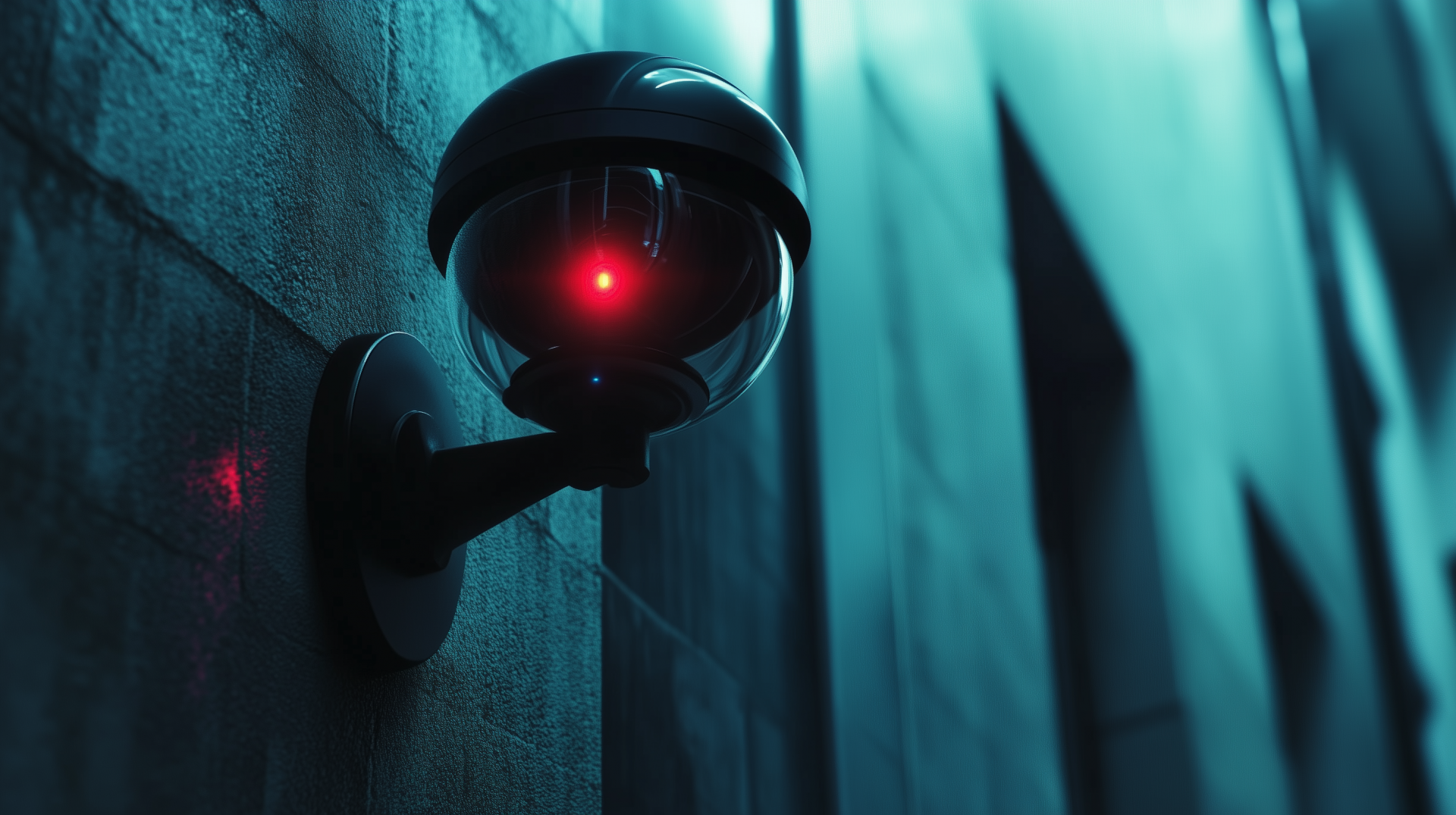 This image depicts a hyper-realistic CCTV security camera installed in the interior of a building. The focus is on the camera's sleek design and its function of monitoring crime scenes, creating an atmosphere of vigilance and security.