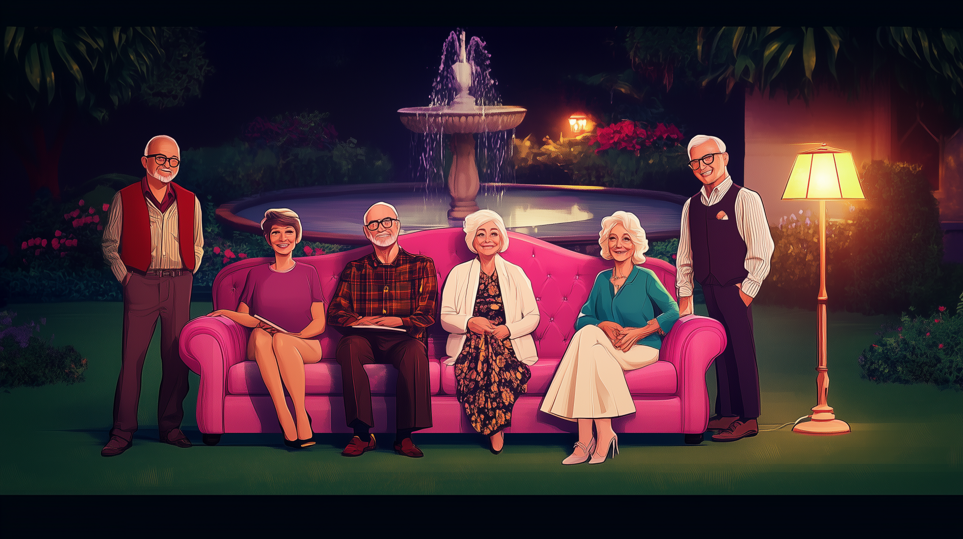 This comic book style illustration features six senior individuals, four of whom are comfortably seated on a pink sofa. The background reveals a serene garden with a fountain, all set in a cozy night ambiance illuminated by a lamp.