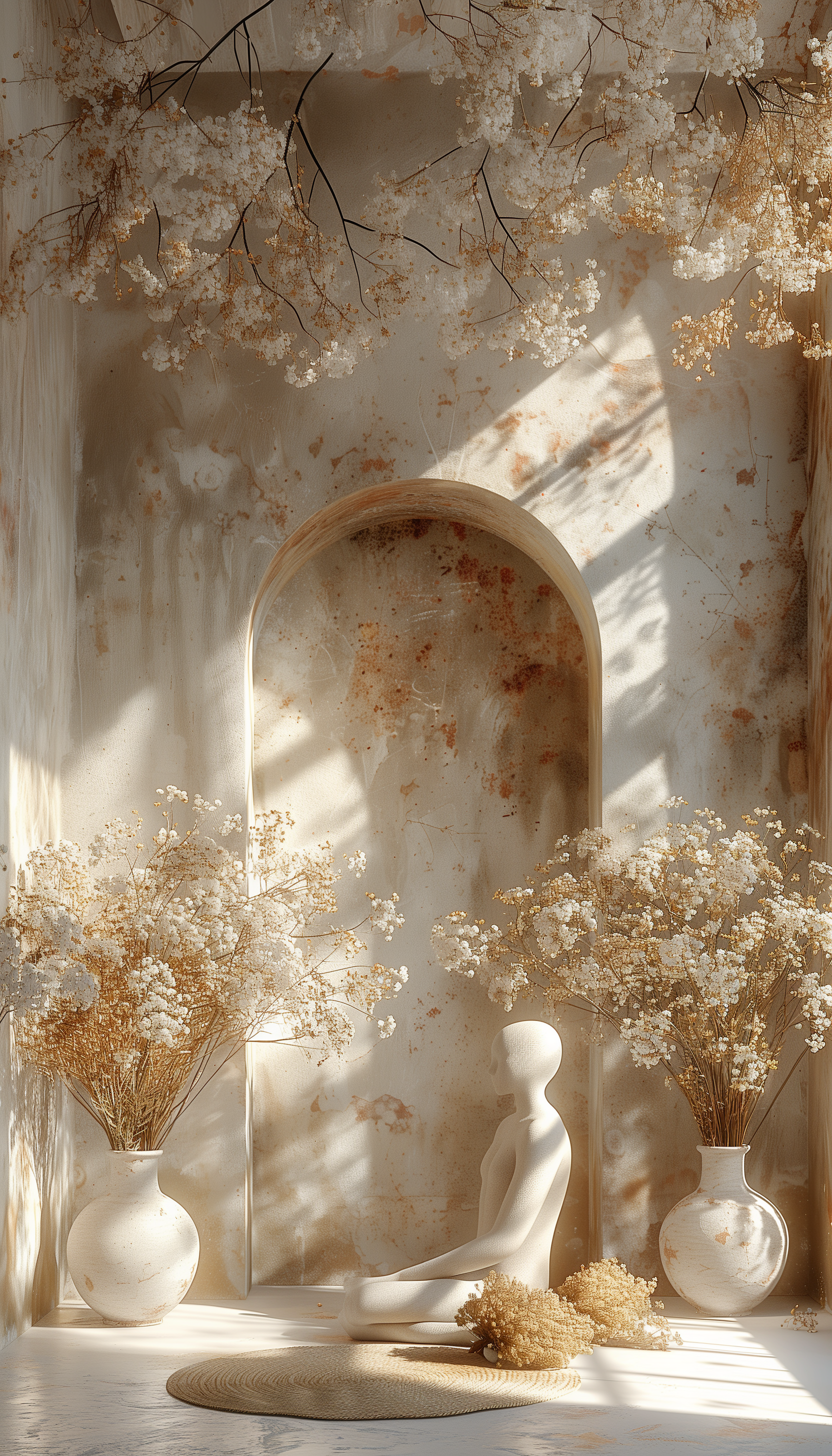 A wall with an arched opening, decorated with dried flowers and vases, featured against an elegant backdrop. The soft natural light highlights the delicate details of the flowers, set in a serene atmosphere with a white floor.