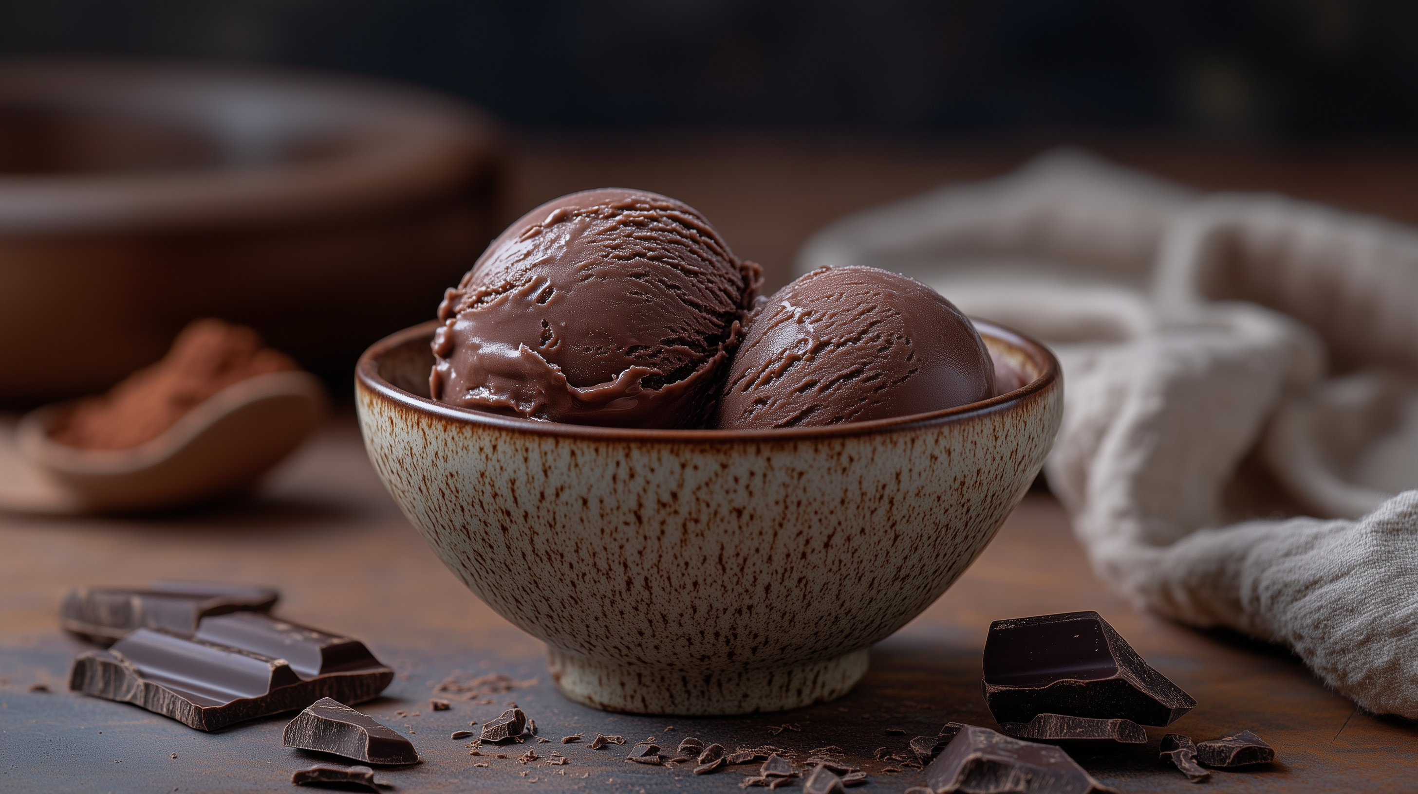 A realistic photo capturing the essence of Japandi style, featuring a ceramic bowl filled with chocolate gelato on a modern wooden table. The dimly lit image showcases cocoa beans, broken chocolate, and a cloth surrounding the bowl.