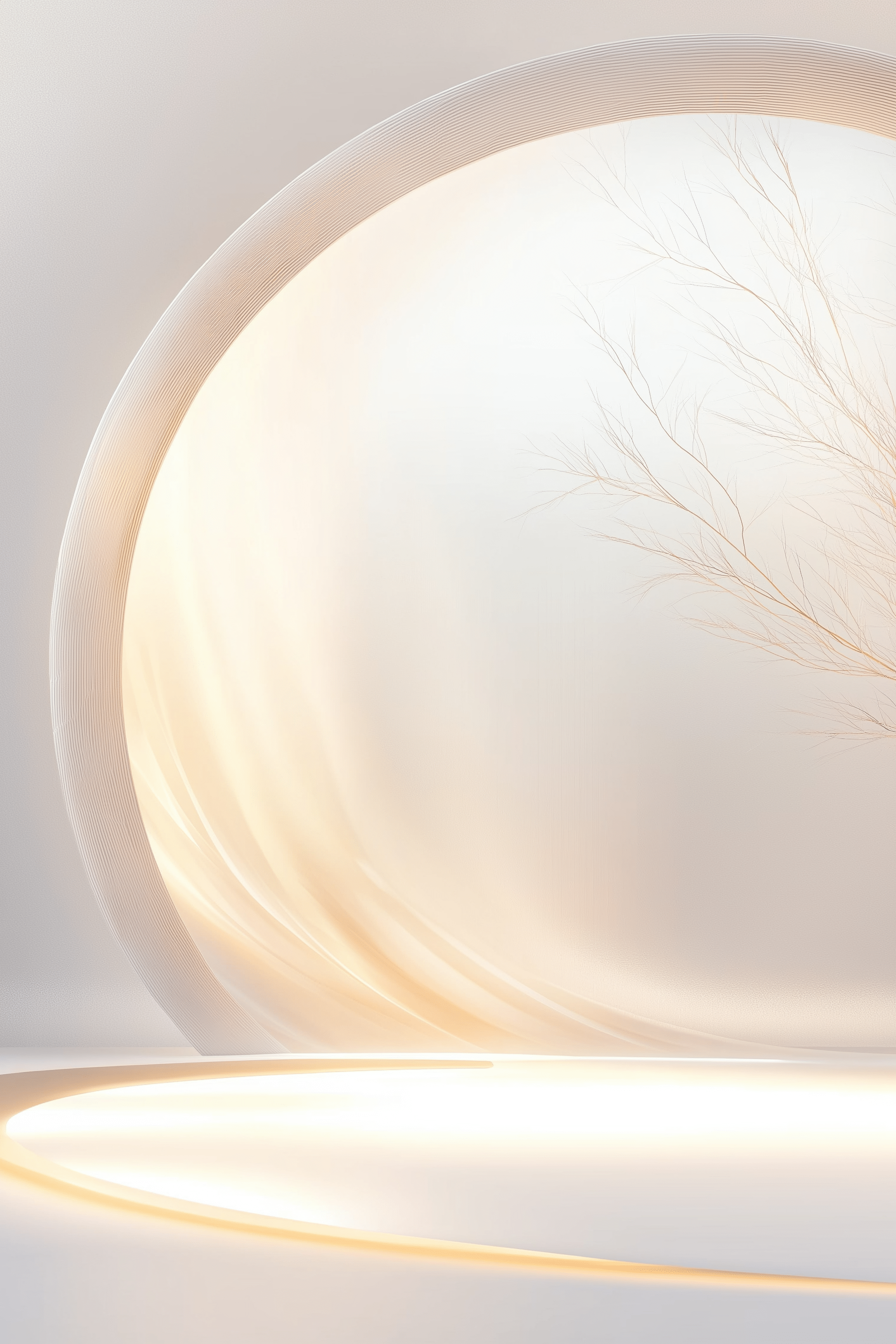The image showcases a soft, ethereal gradient with gentle curves and a calming light gold and white color scheme. Blurred edges and a circular focus create a serene and dreamlike atmosphere.