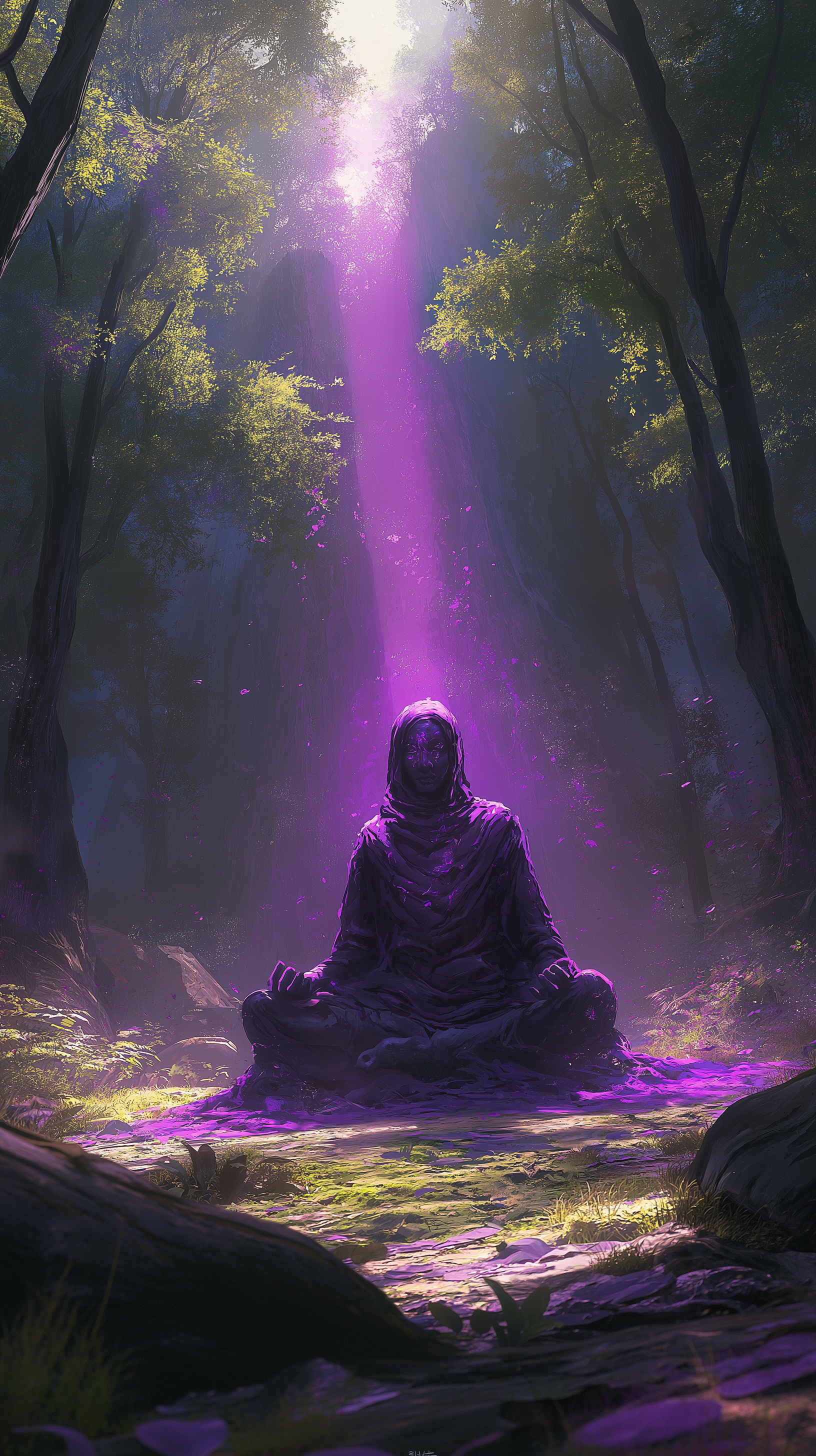 A glowing purple humanoid figure is depicted in a meditative pose amidst a tranquil forest. The calming light from the figure casts soft purple hues on the surrounding trees and lush foliage.