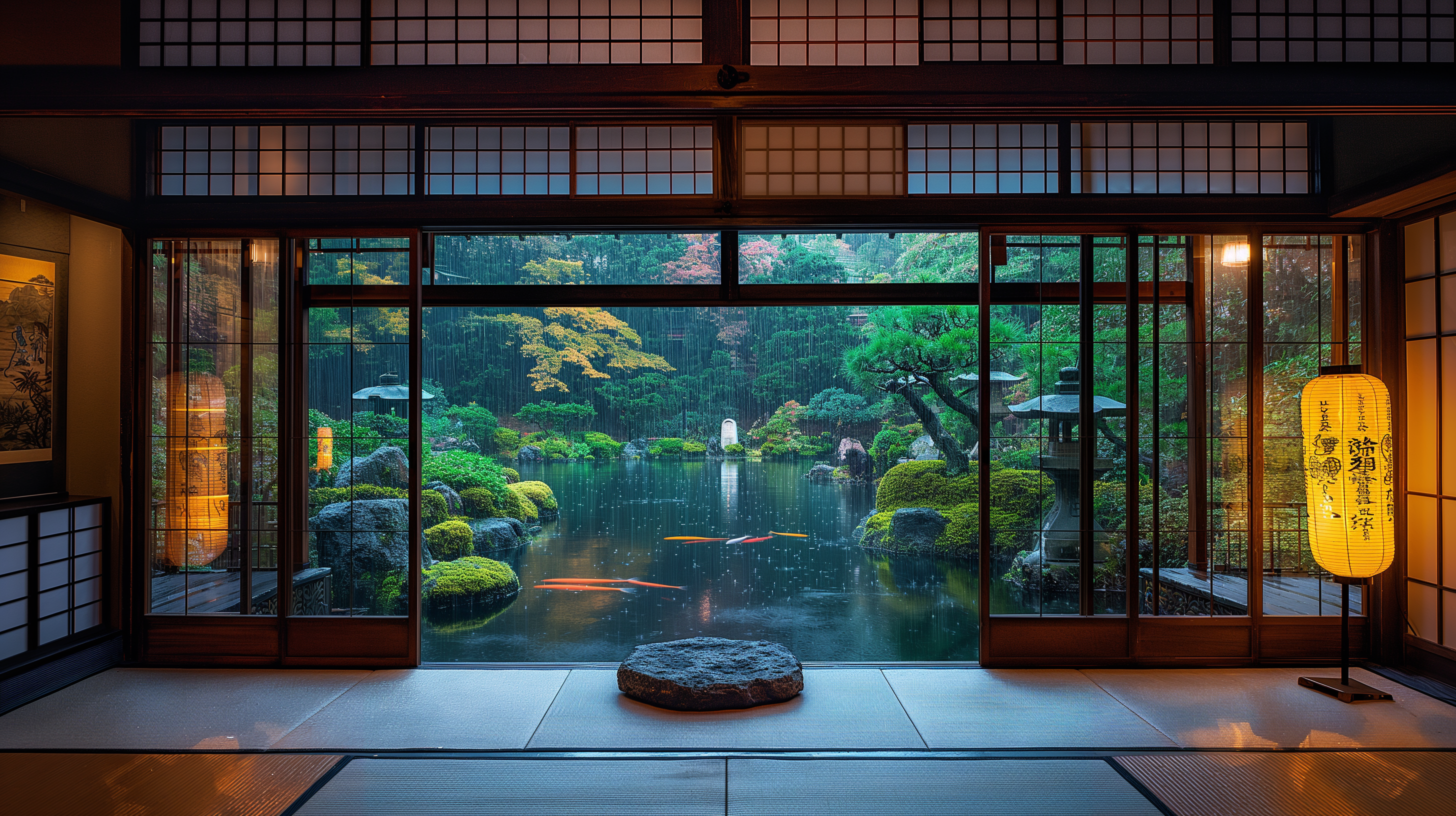 Traditional Japanese room overlooking a serene garden with koi pond, lush vegetation, and rain, accented by a glowing lantern.