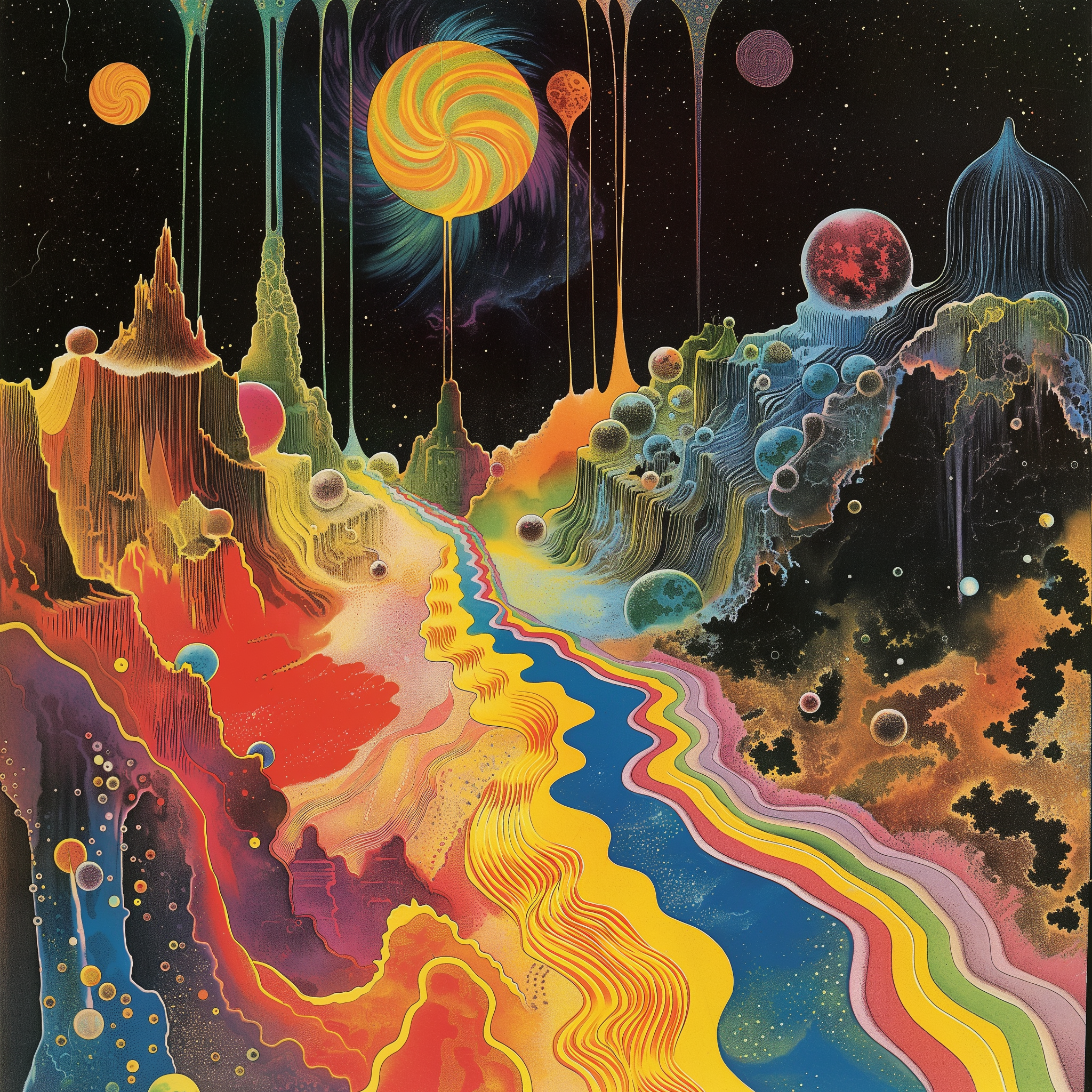 An artistic interpretation of the biblical creation story, featuring a celestial scene with a heavenly glow and earthy elements. The style is reminiscent of 1960s art, with vibrant colors and a psychedelic touch.