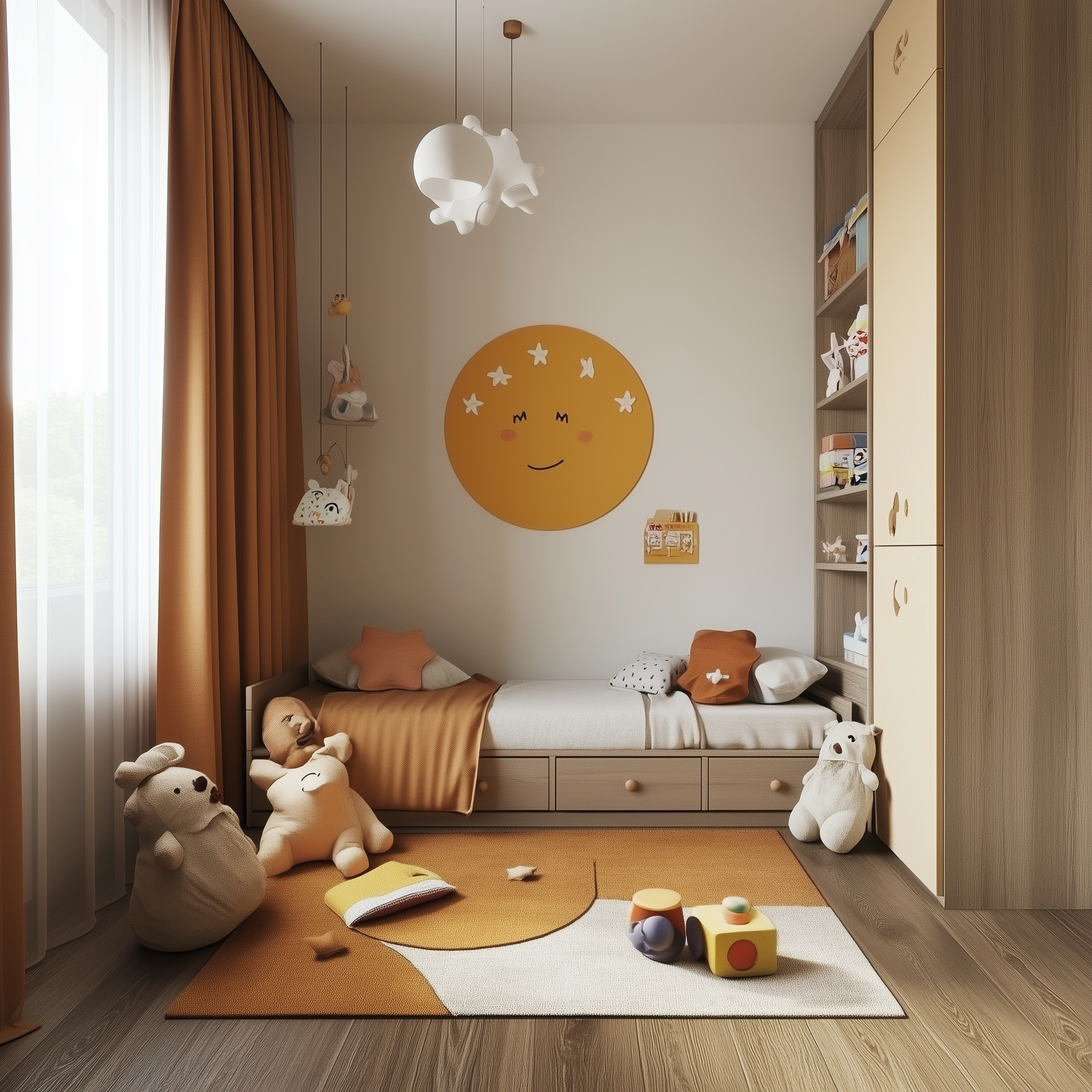 A minimalistic child's room decorated in shades of brown and hints of orange. The room exudes a calming, pastel color palette, creating a serene and cozy atmosphere.