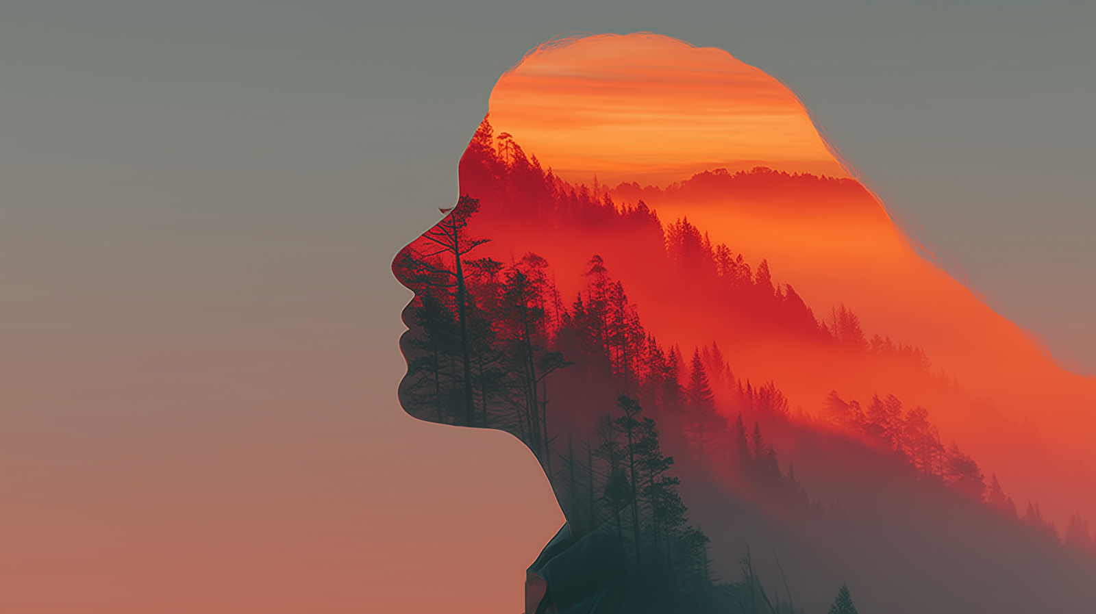 This illustration features a silhouette of a human head filled with a tranquil sunset landscape. The soft glowing tones create an atmosphere of meditation and inner balance.