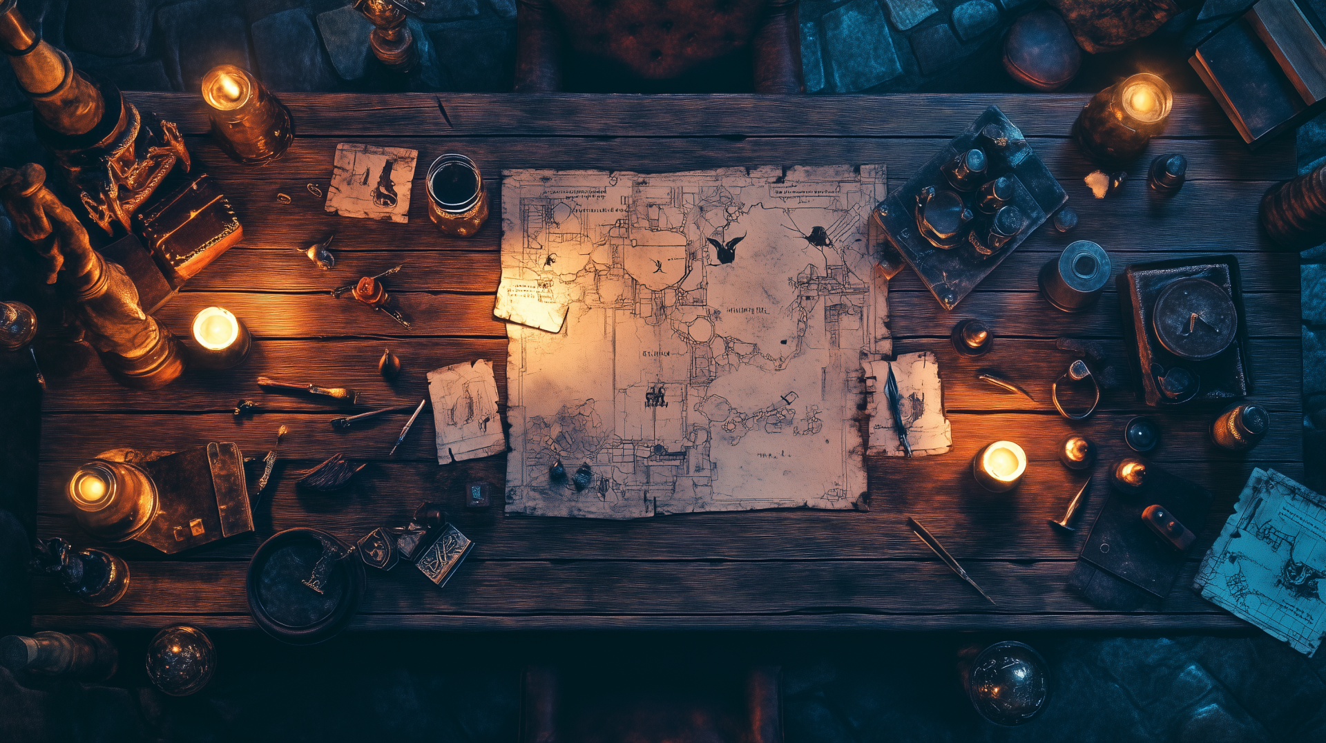 The image captures a top down view of a dimly lit tavern tabletop, where several rogues gather to devise their heist. The old wooden table is cluttered with tools, maps, and an atmosphere of intrigue and suspense.