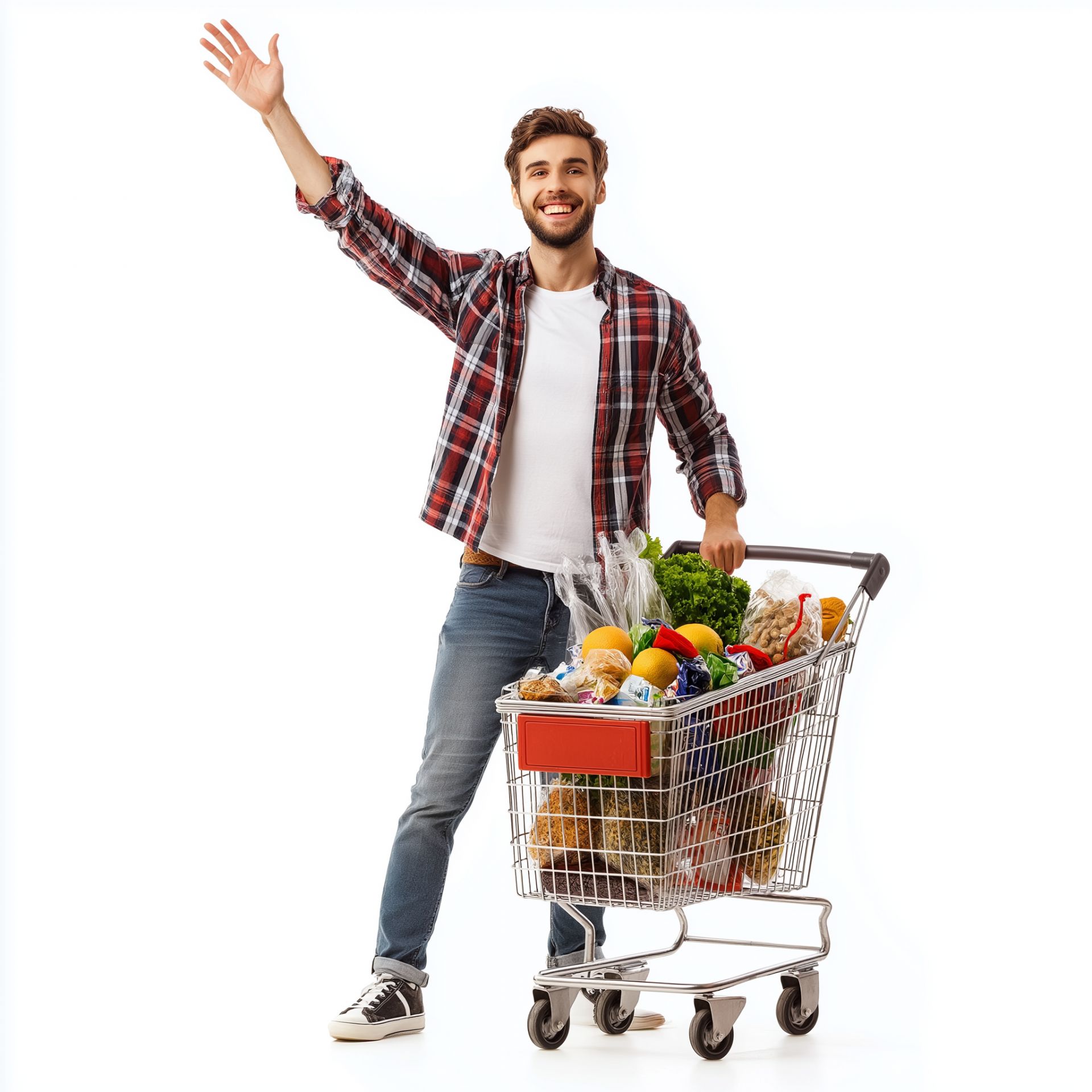 A young man is joyfully shopping at the supermarket, radiating happiness as he raises one hand in excitement. The ultra-realistic depiction captures the vibrant atmosphere of grocery shopping, highlighting the man's cheerful demeanor.