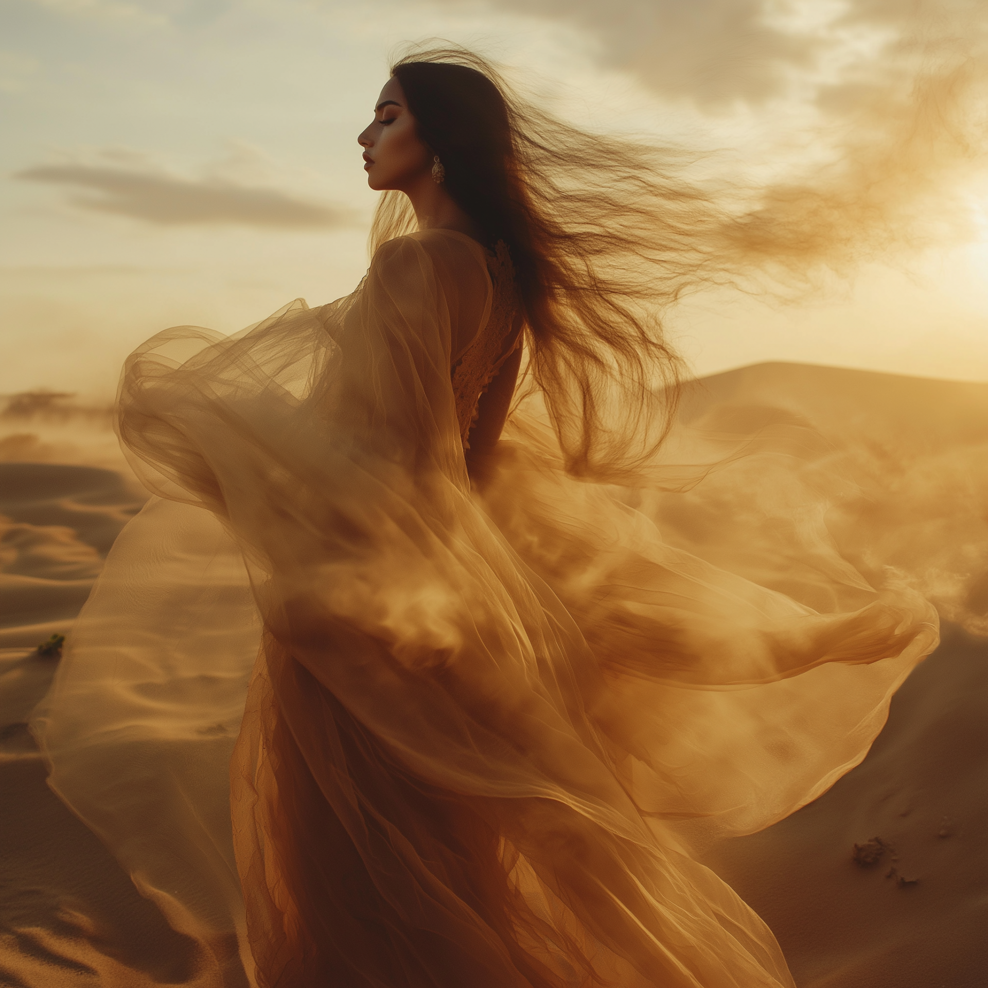The image features a model gracefully walking through a golden hour desert, her flowing silk accentuating her movement. Wisps of bakhoor smoke trail behind her, adding a mystical aura to the serene and natural landscape.