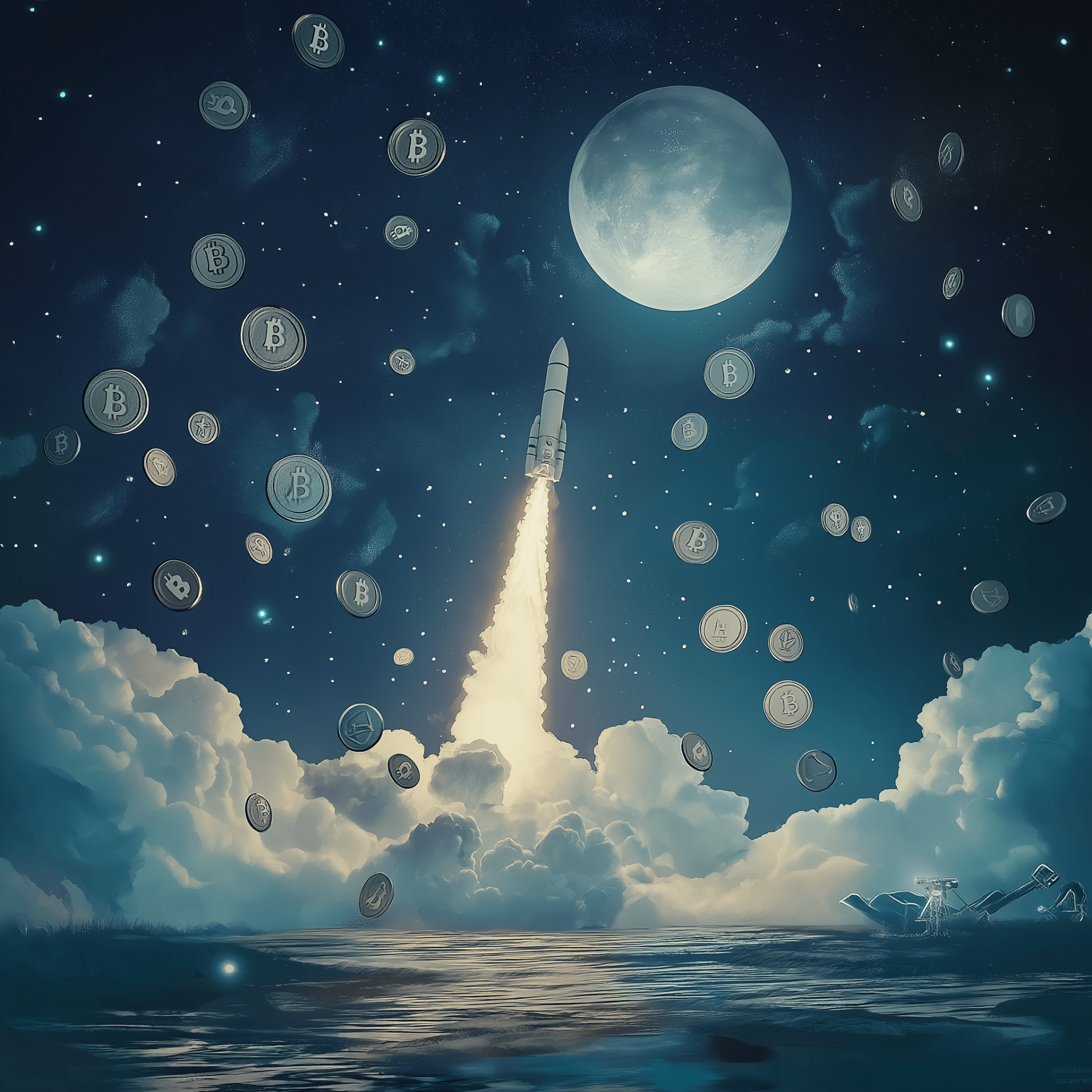 The image depicts a surreal scene where hundreds of metallic silver coins rain down against a dark night sky. A vibrant rocket ship ascends into the atmosphere, leaving a trail of colorful smoke, with a bright full moon illuminating the backdrop.