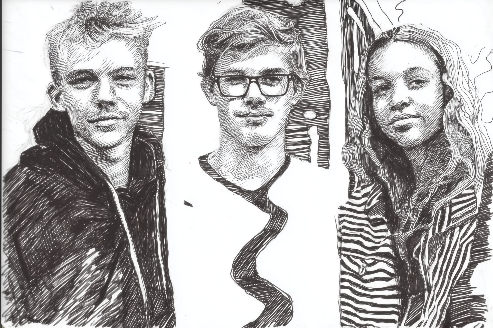 This image features a minimalistic line drawing of a bouquet consisting of three irises, elegantly tied with a bow. The clean, thick outlines create a striking yet simple aesthetic, devoid of color and shadows.