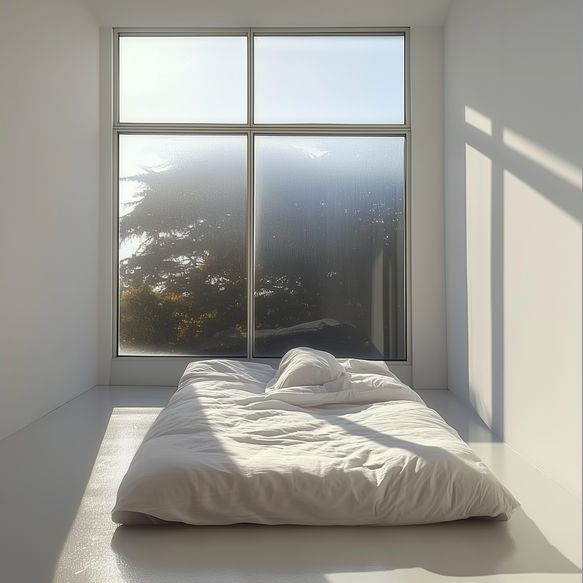 The image features a single bed in a vast, empty white room that radiates tranquility. Soft natural light enters through a large window, emphasizing the minimalist and serene atmosphere of the space.