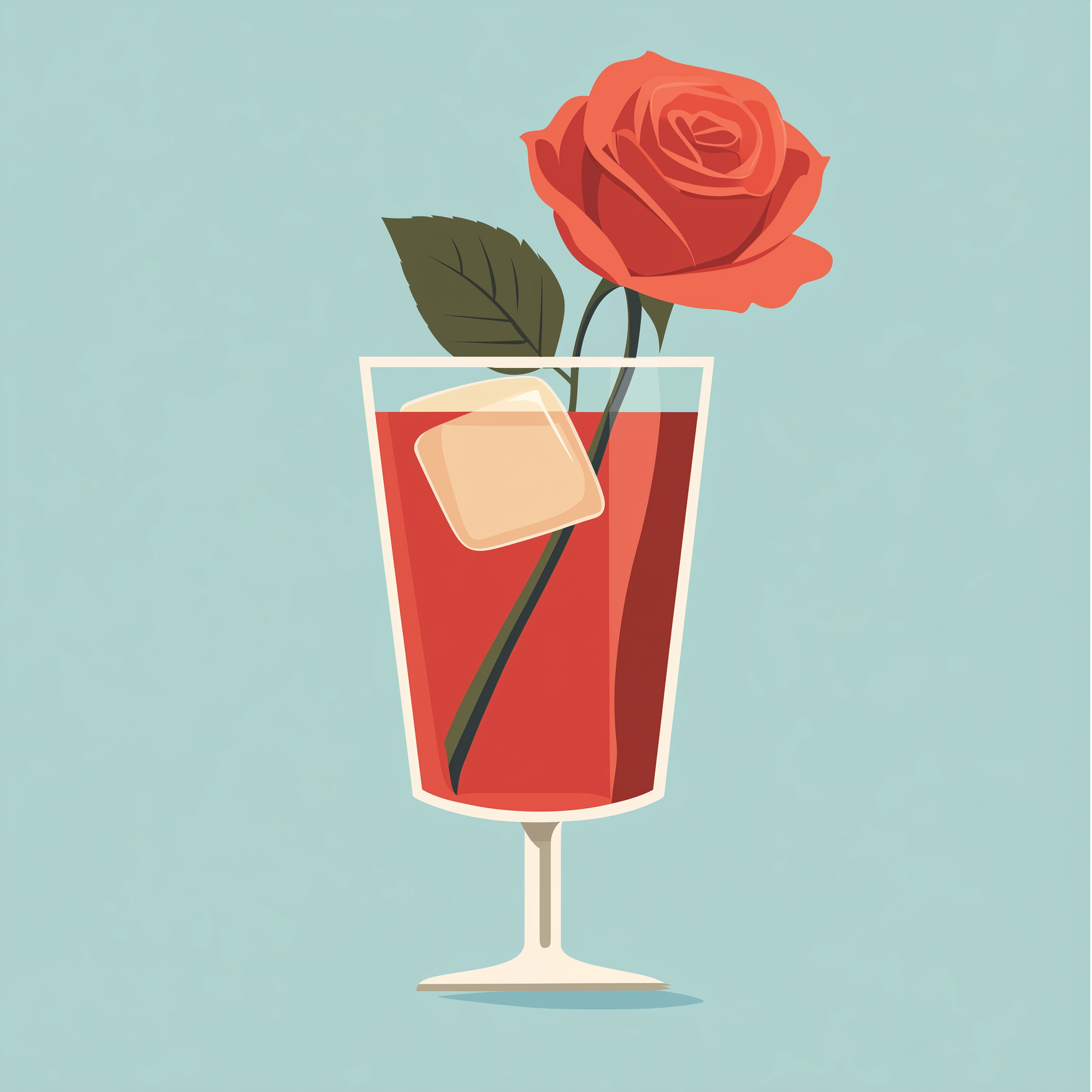 This illustration features a flat design of red rose tea with a minimalistic approach. It showcases the antique packaging style with a simplified color palette and the presence of ice cubes for a refreshing feel.