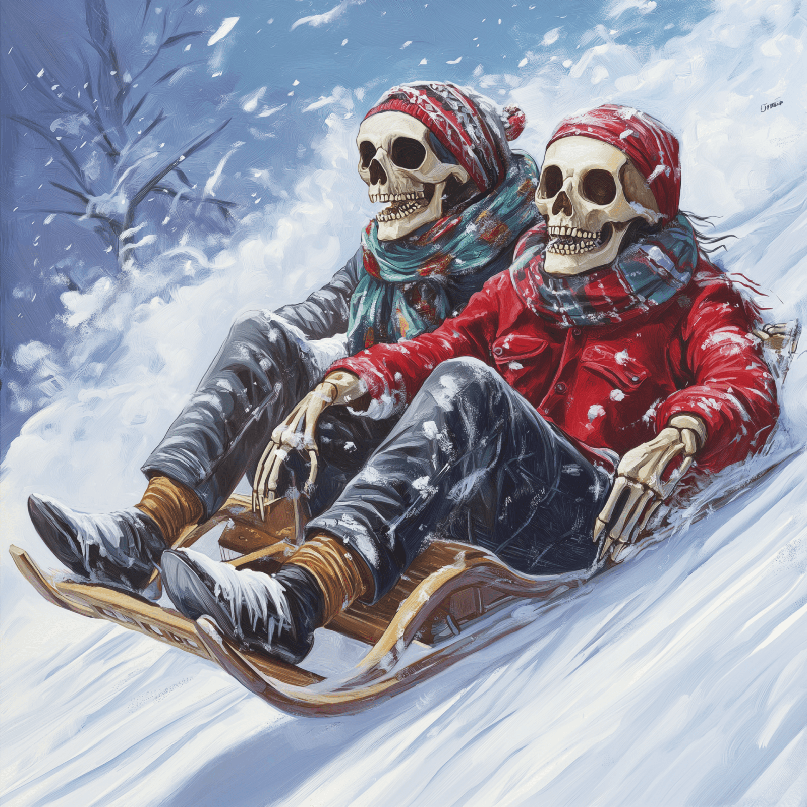 The image captures two playful skeletons racing down a snowy hill on a sled. Both skeletons are dressed in colorful winter clothes and scarves, creating a fun and whimsical atmosphere.