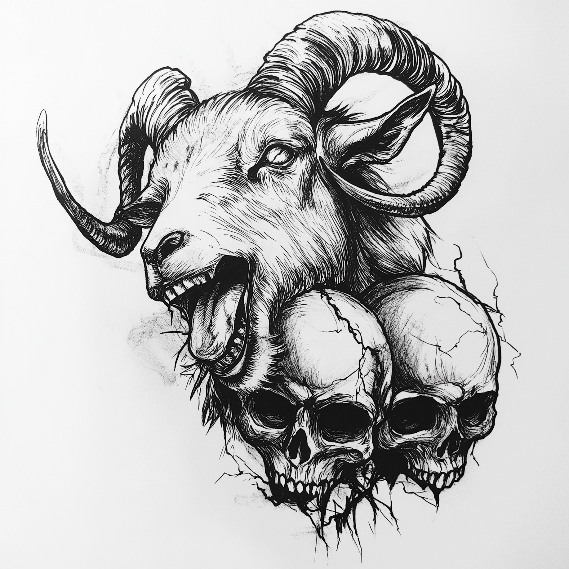 This image showcases a striking black and white sketch featuring a goat's head licking human skulls. The graphic style enhances the intricate details and creates a bold contrast, making it ideal for a tattoo design.