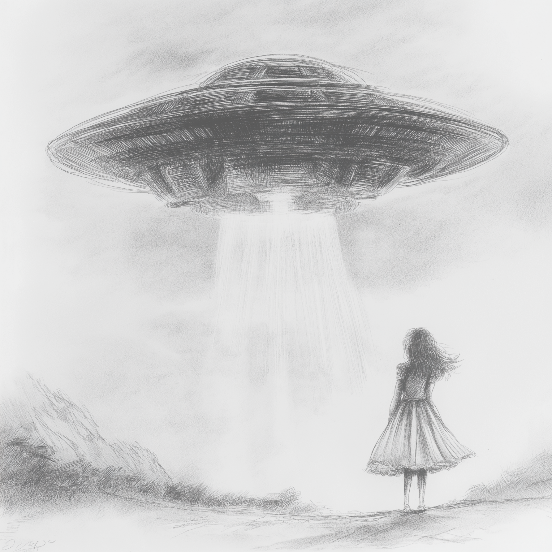 This illustration captures a futuristic UFO hovering in the sky, surrounded by a sense of wonder. A young girl in a flowing dress stands below, her gaze fixed on the glowing craft above, creating an ethereal atmosphere.