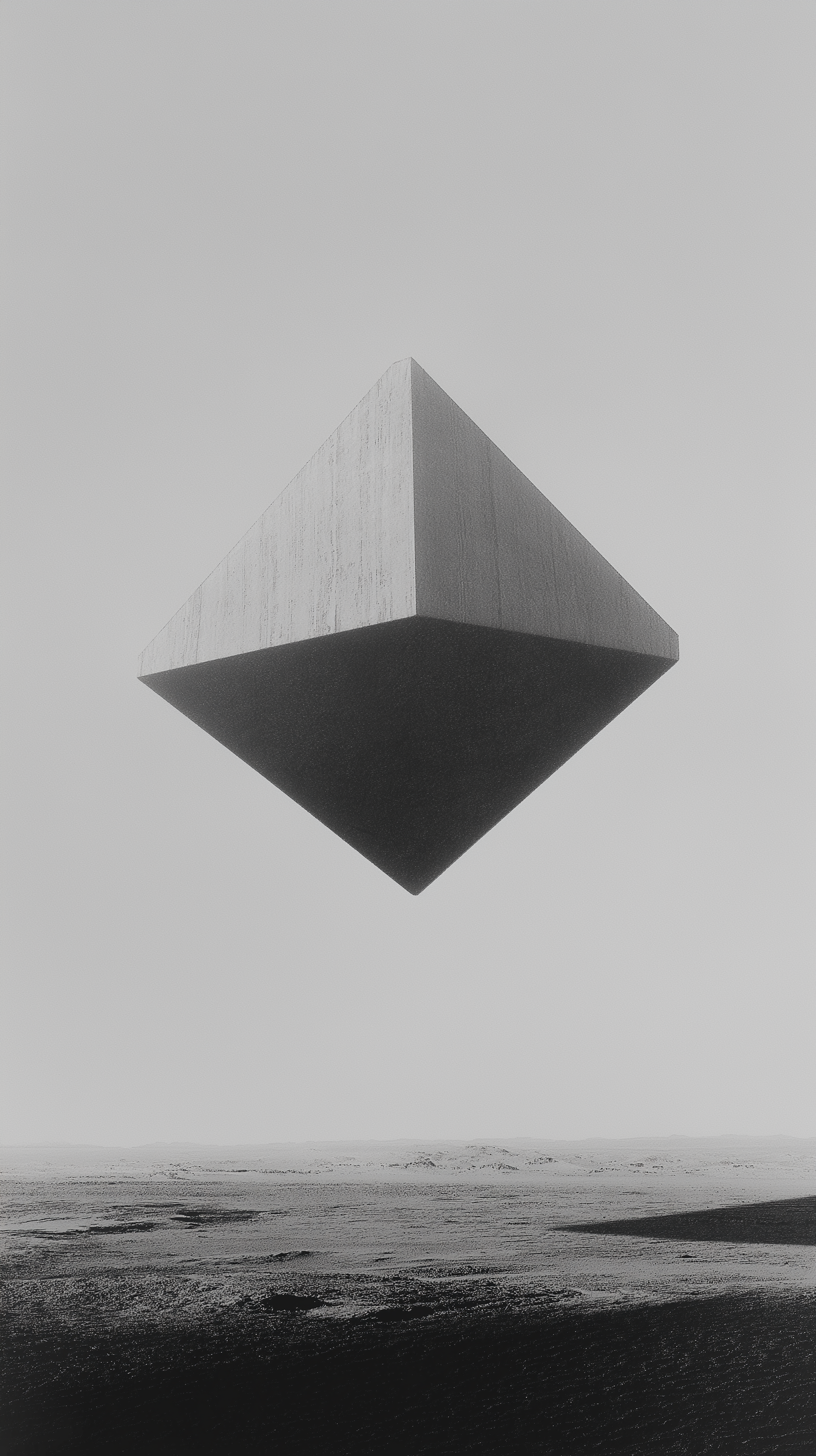 The image features a minimalist illustration of a flying pyramid, crafted with pencil in shades of white and black. Its clean lines and geometric shapes create a sense of surrealism and abstract thought.