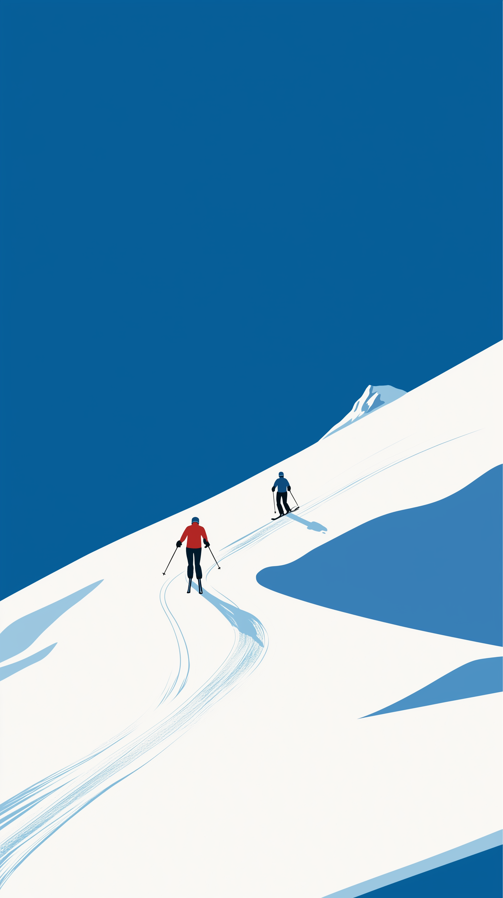 This illustration features a dynamic scene of skiers expertly carving through snow in a minimalist style. The bright blue sky and vintage aesthetics evoke a nostalgic feeling reminiscent of the 1950s.