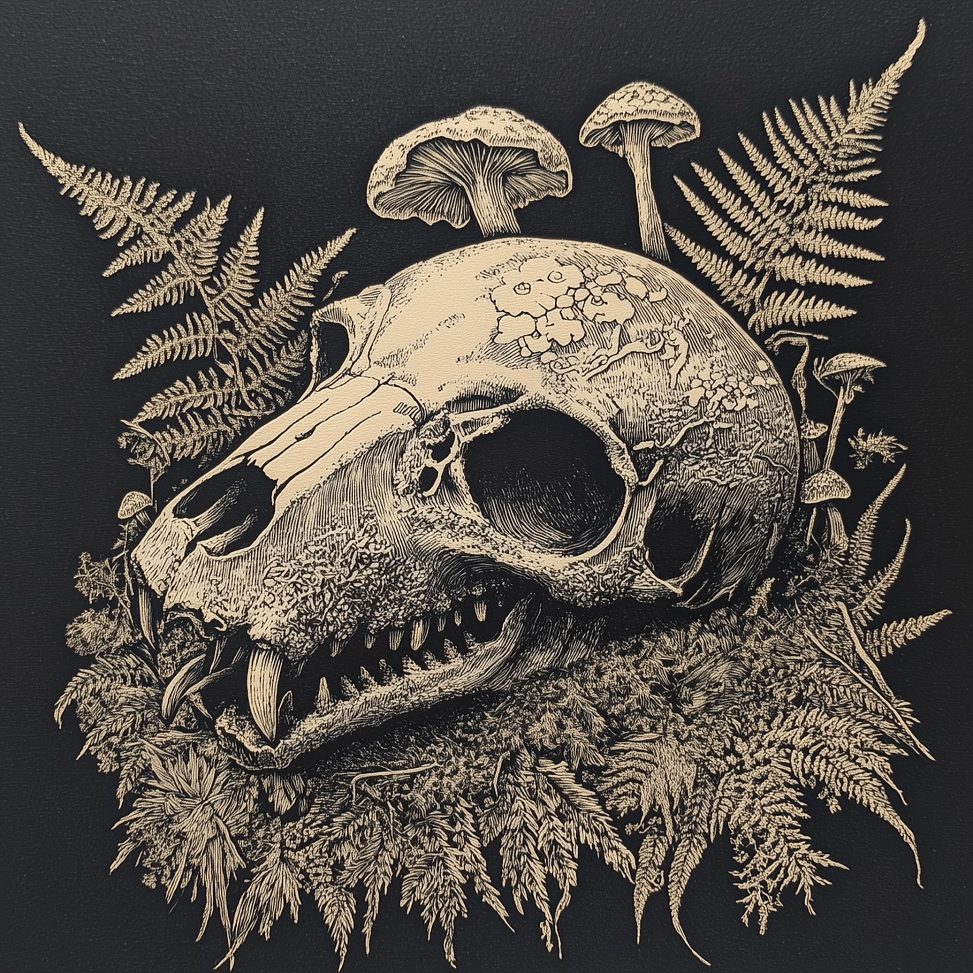 The engraving features a detailed black and gold anatomical portrayal of a possum skull, elegantly resting on a bed of vibrant moss. Surrounding the skull are delicate ferns and whimsical mushrooms, creating a natural and intriguing composition.