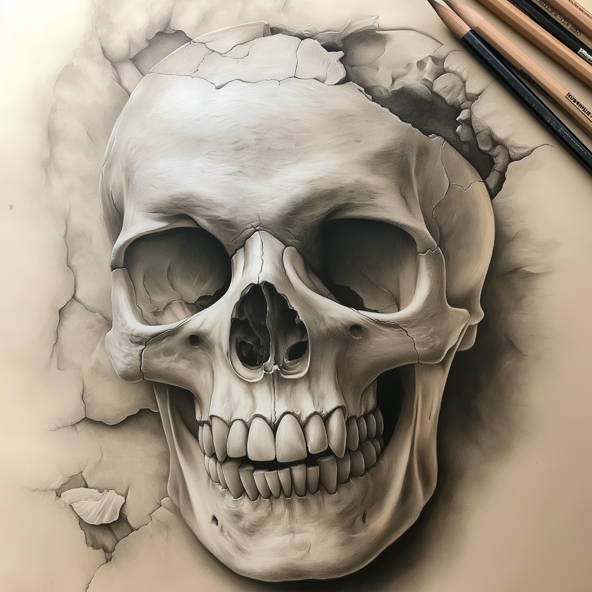 This image features a highly detailed drawing of a skull, capturing every intricate shadow and texture. The realism style evokes a sense of depth and authenticity, making the skull appear almost lifelike.
