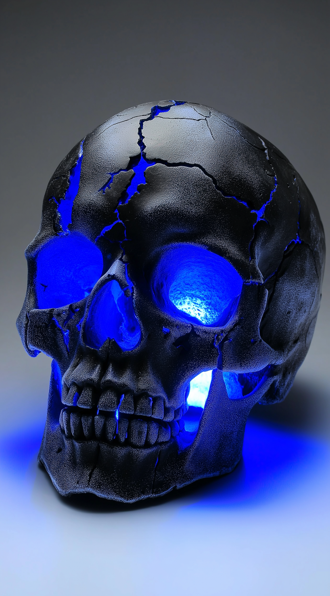 The image showcases a highly realistic human skull with a torn texture set against a gradient background transitioning from blue to black. High contrast highlights the intricate details of the skull, enhanced by reflective blue light emanating from within.