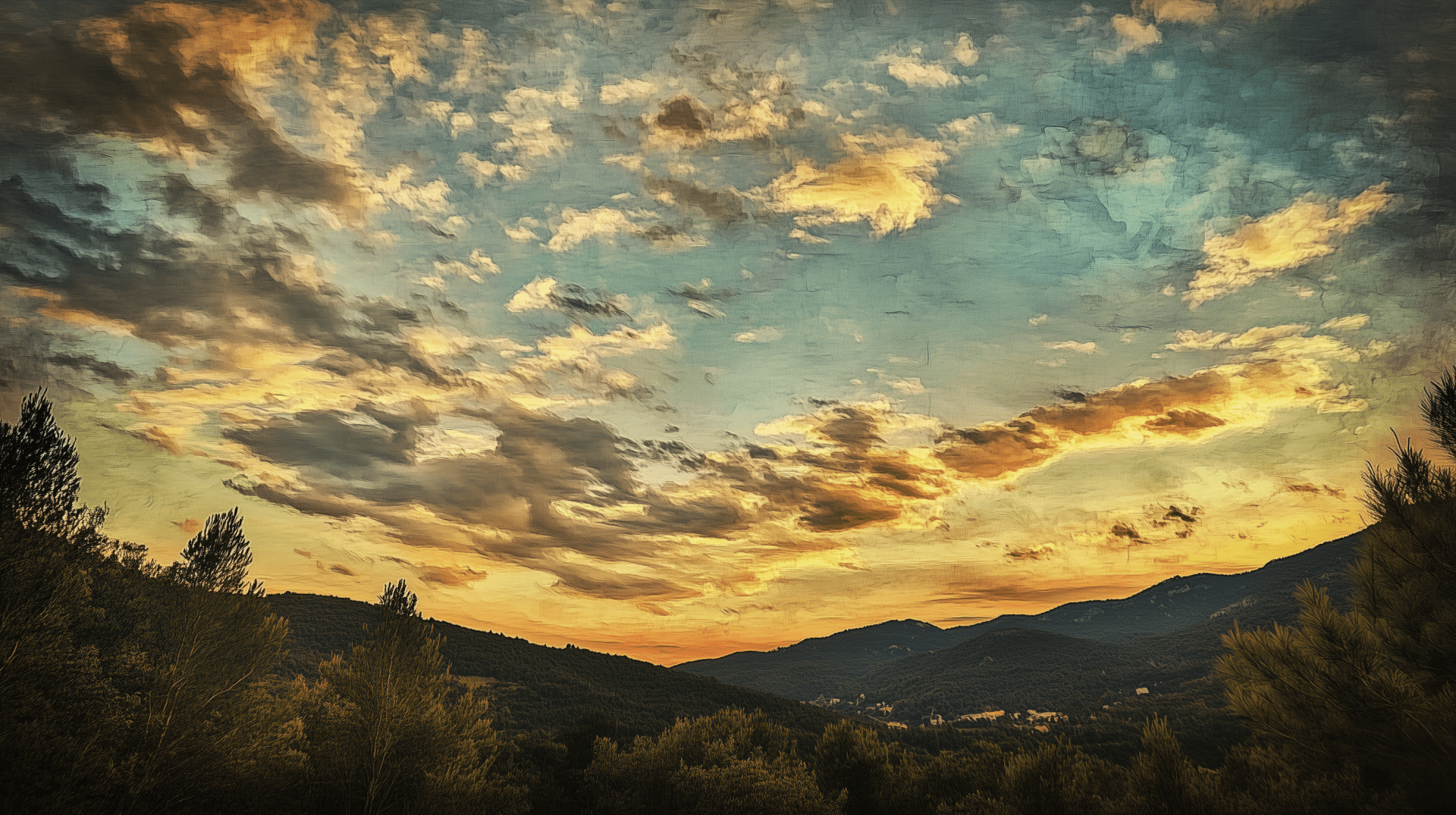 The image showcases a beautifully rugged and hand-drawn depiction of a sunset sky filled with clouds. The natural and dappled lighting evokes a sense of adventure and preparedness.