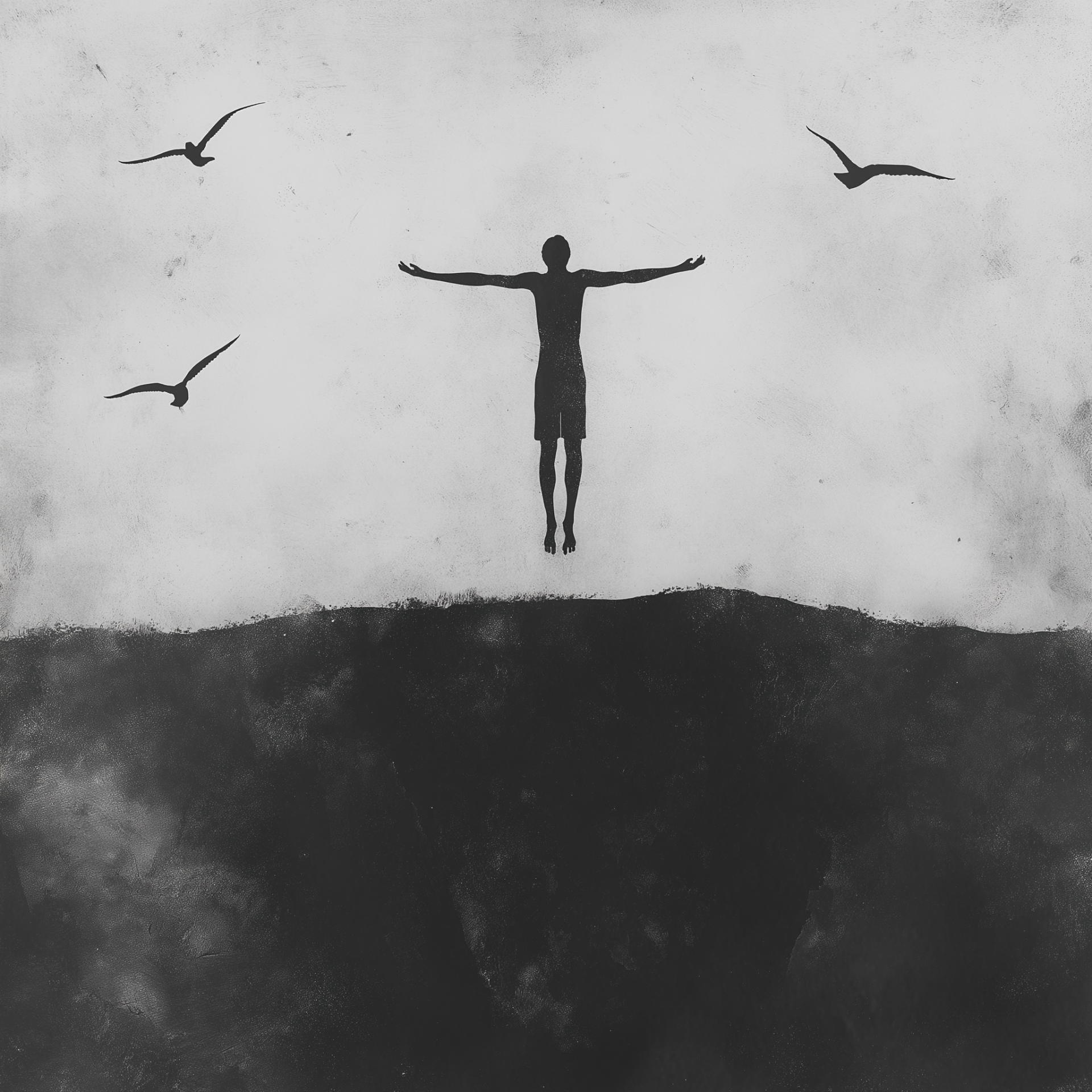 The image features a person with arms outstretched and wings spread wide, soaring above an island. The dark gray background enhances the minimalist style, while the use of black and white ink wash techniques adds depth to the scene.