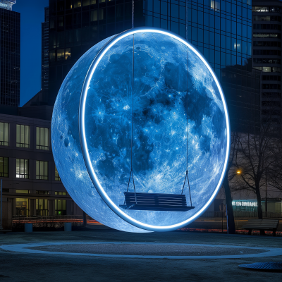 A mesmerizing night aerial view of a bustling city with bright lights and illuminated skyscrapers, reflecting on the calm waters below.