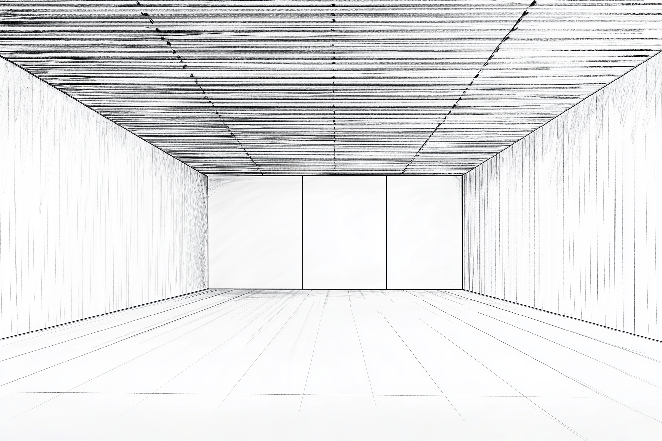 A simple and minimalistic pencil sketch of a large empty room with blank walls and a wooden slat ceiling. The perspective drawing focuses on the architectural details of the room.