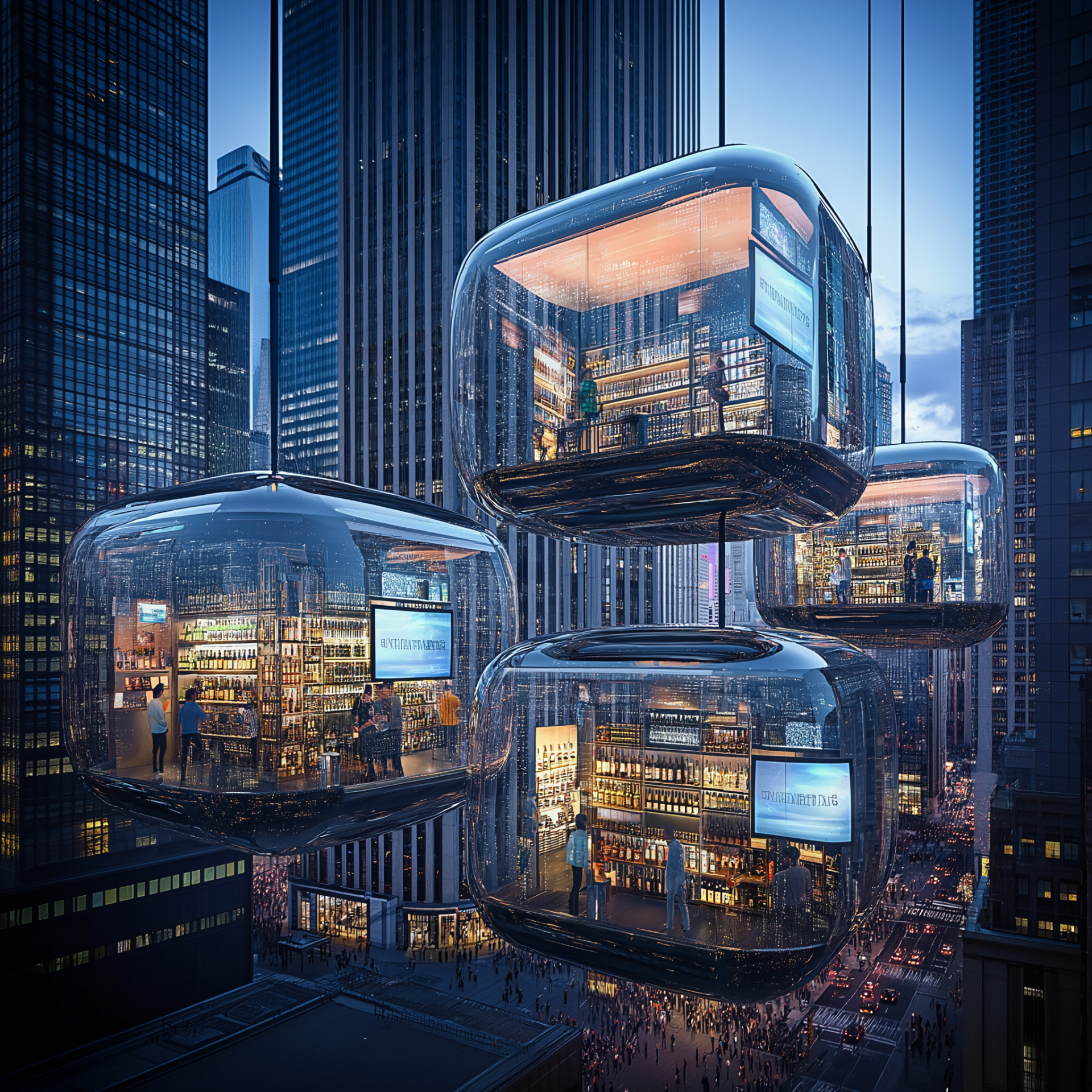 The image depicts five glass floating pods hovering in the evening sky over New York City. Each pod features large digital displays and shows people engaging in shopping and tasting experiences, creating a futuristic atmosphere.