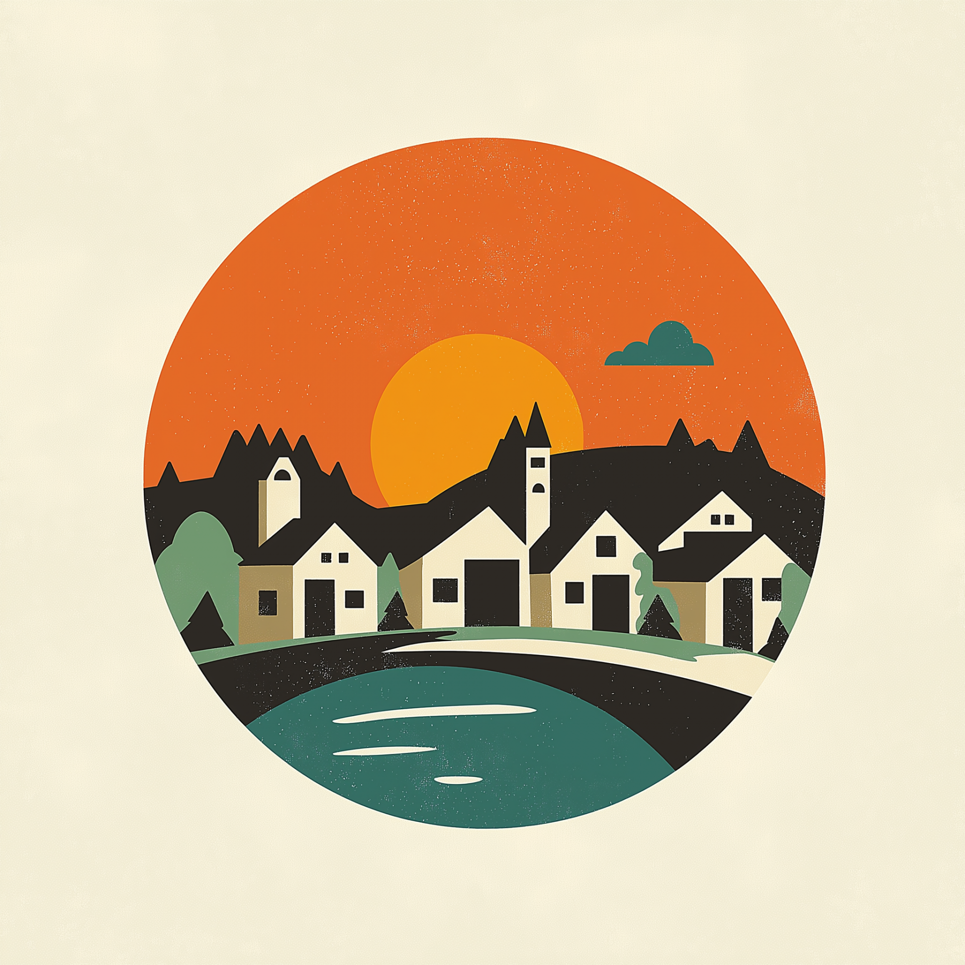 The logo features bold geometric shapes and a minimalist design, reminiscent of classic Saul Bass styles. It combines vibrant colors and simple lines to create an impactful visual representation of the small town's identity.
