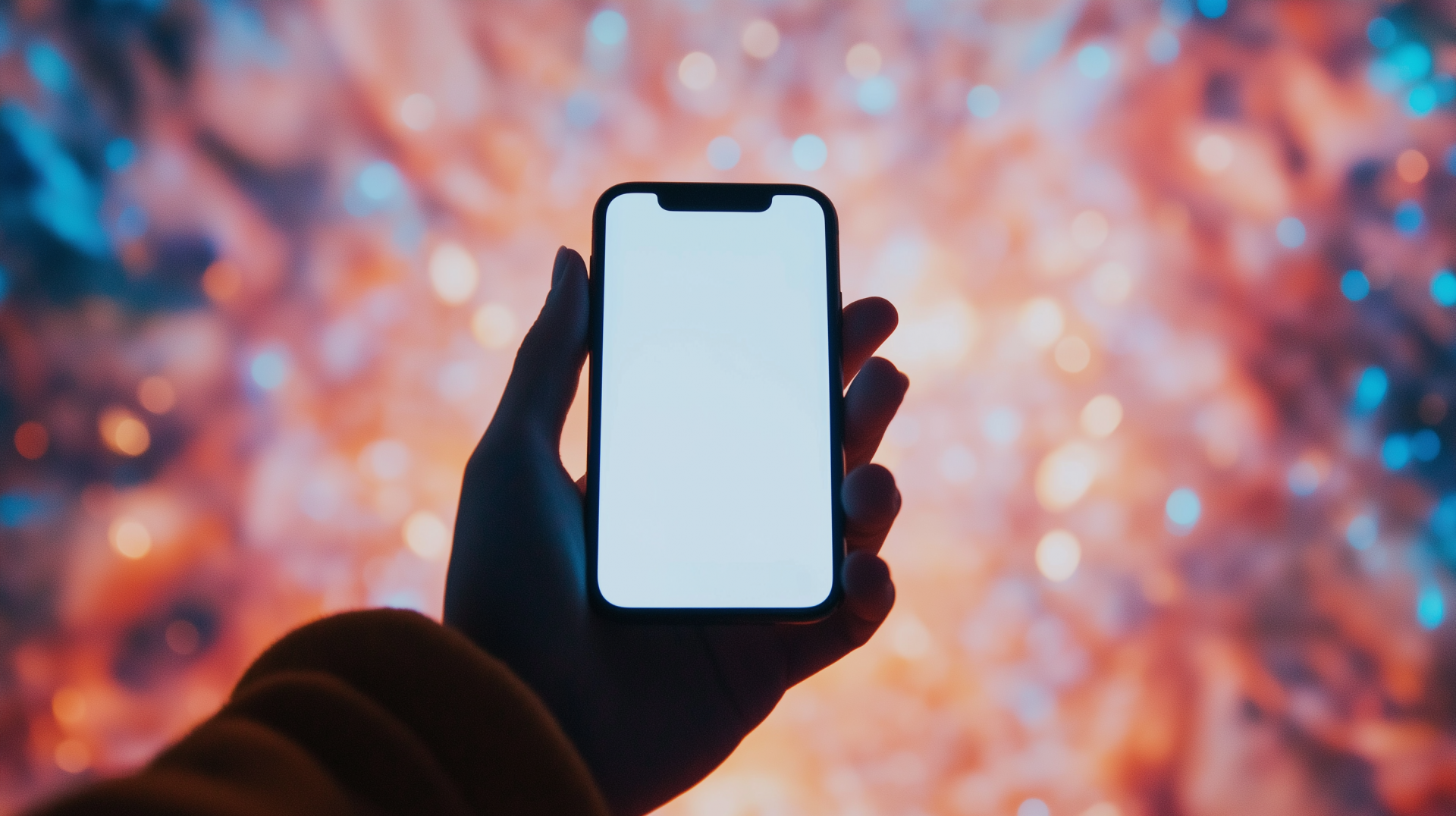 The image features a hand grasping an iPhone, showcasing a blank white screen. The soft-focus background reveals a vibrant and immersive environment within the Fever Bubble Planet experience.