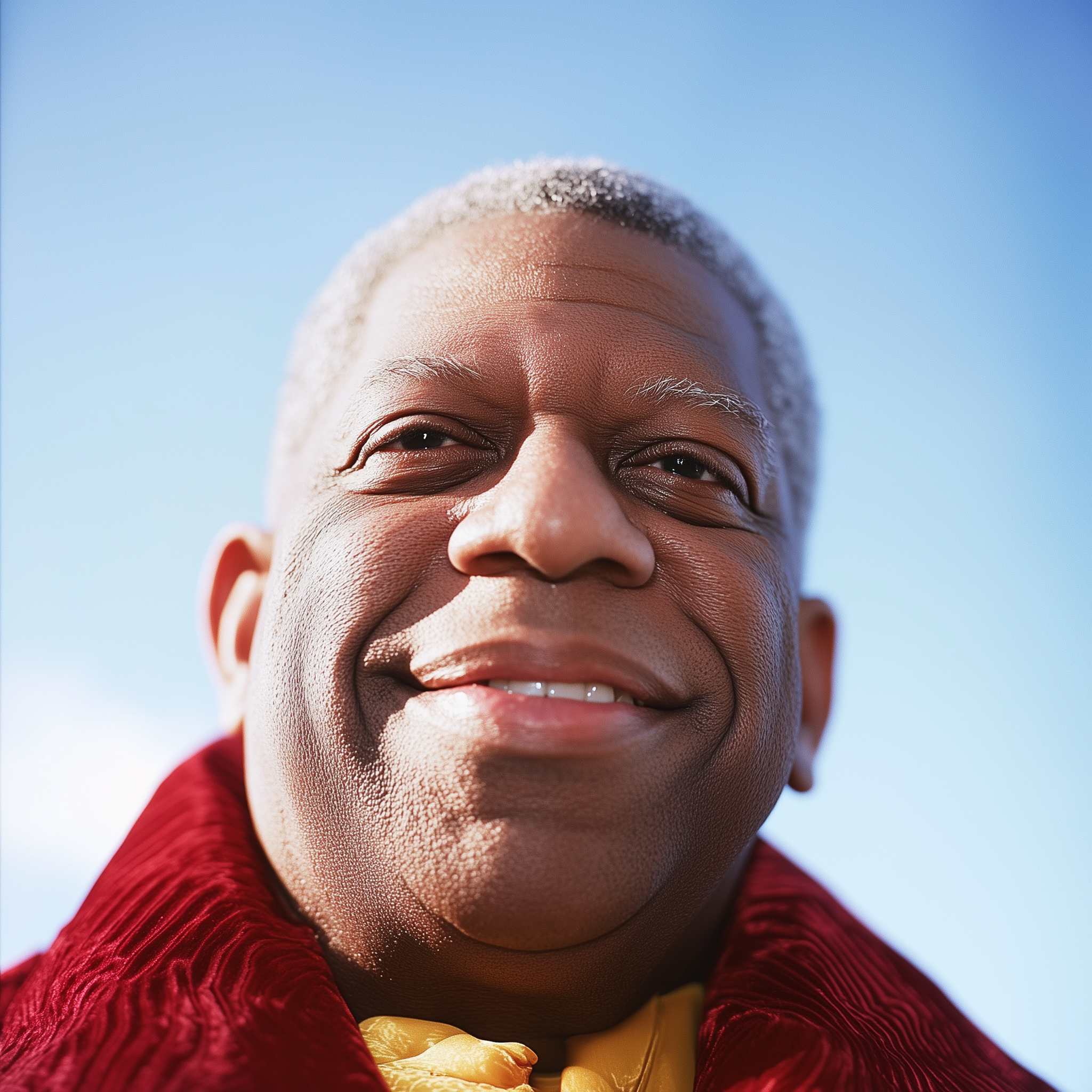 This image features a low angle portrait of a middle-aged black male with a warm smile. He looks directly into the camera, exuding confidence and positivity.