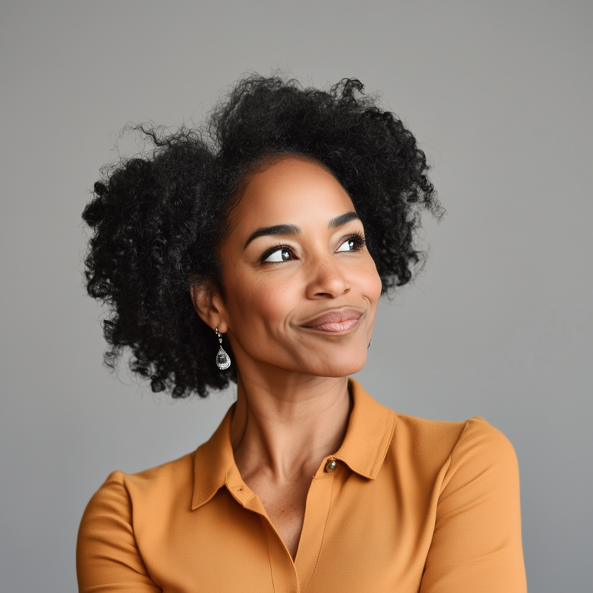 A 45-year-old African American woman is captured looking to the side with a shocked smile on her face. The image highlights her natural beauty and expressive features, evoking a sense of surprise and joy.