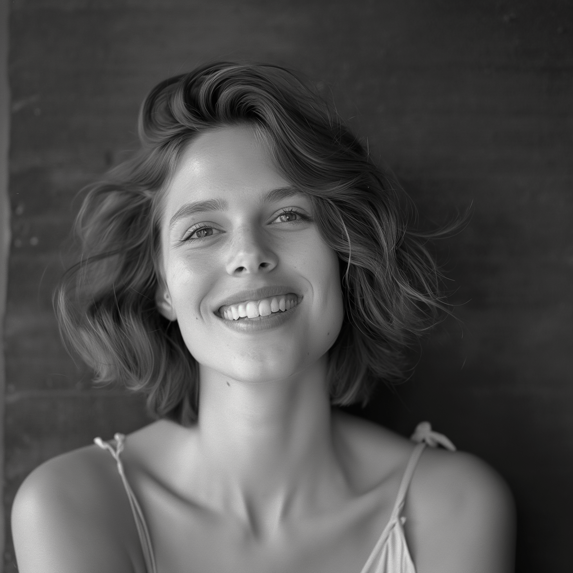 The image captures a vibrant young woman displaying a wide, beautiful smile that radiates warmth and positivity. She has a classic shoulder pose that conveys confidence and joy, set against a soft, inviting background.